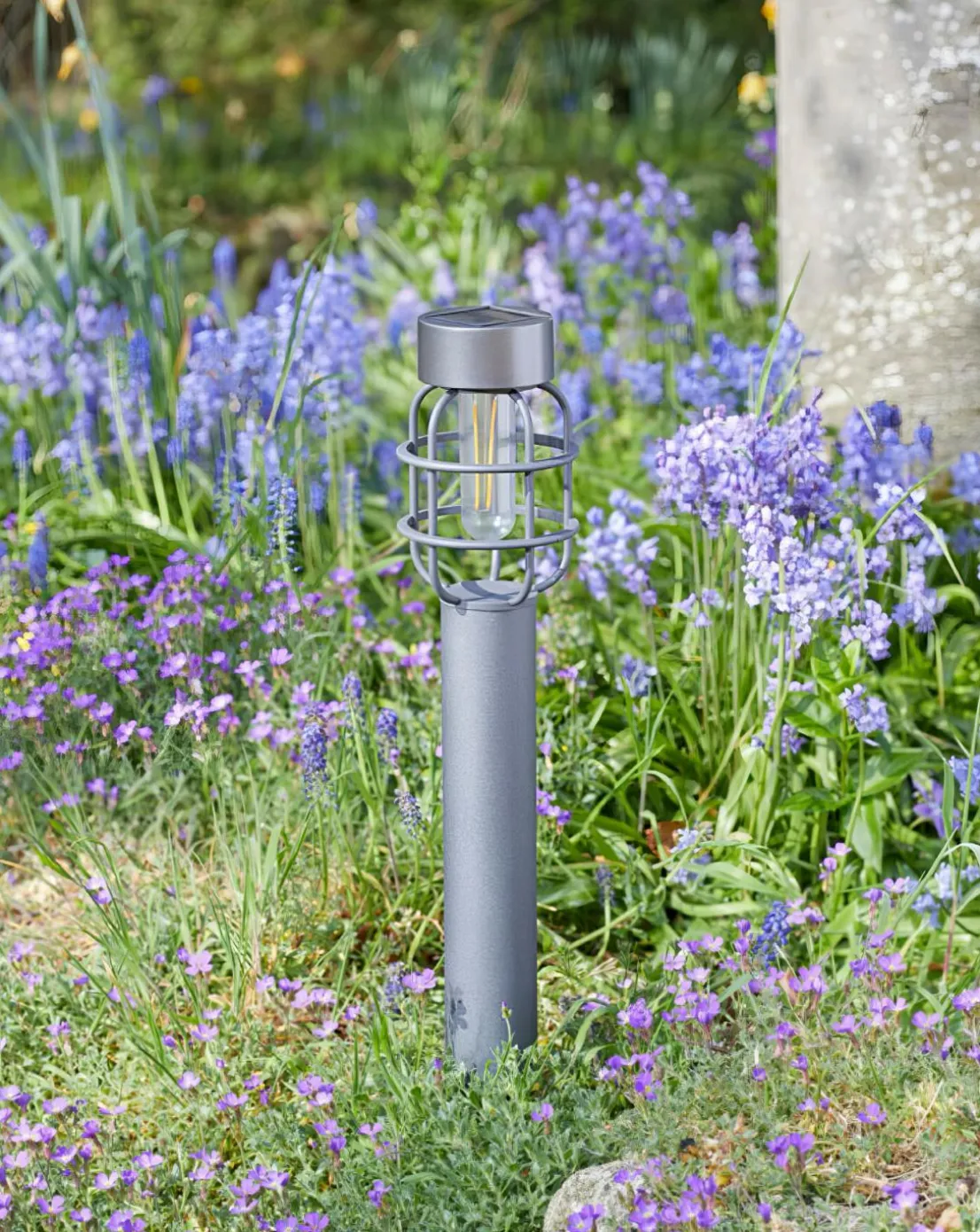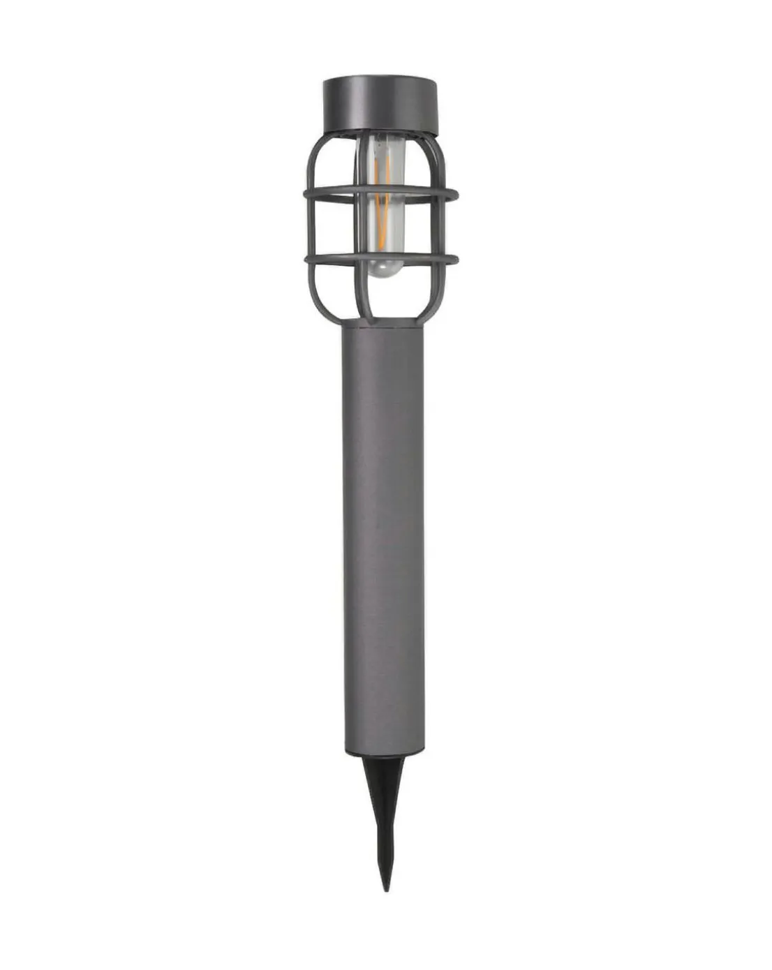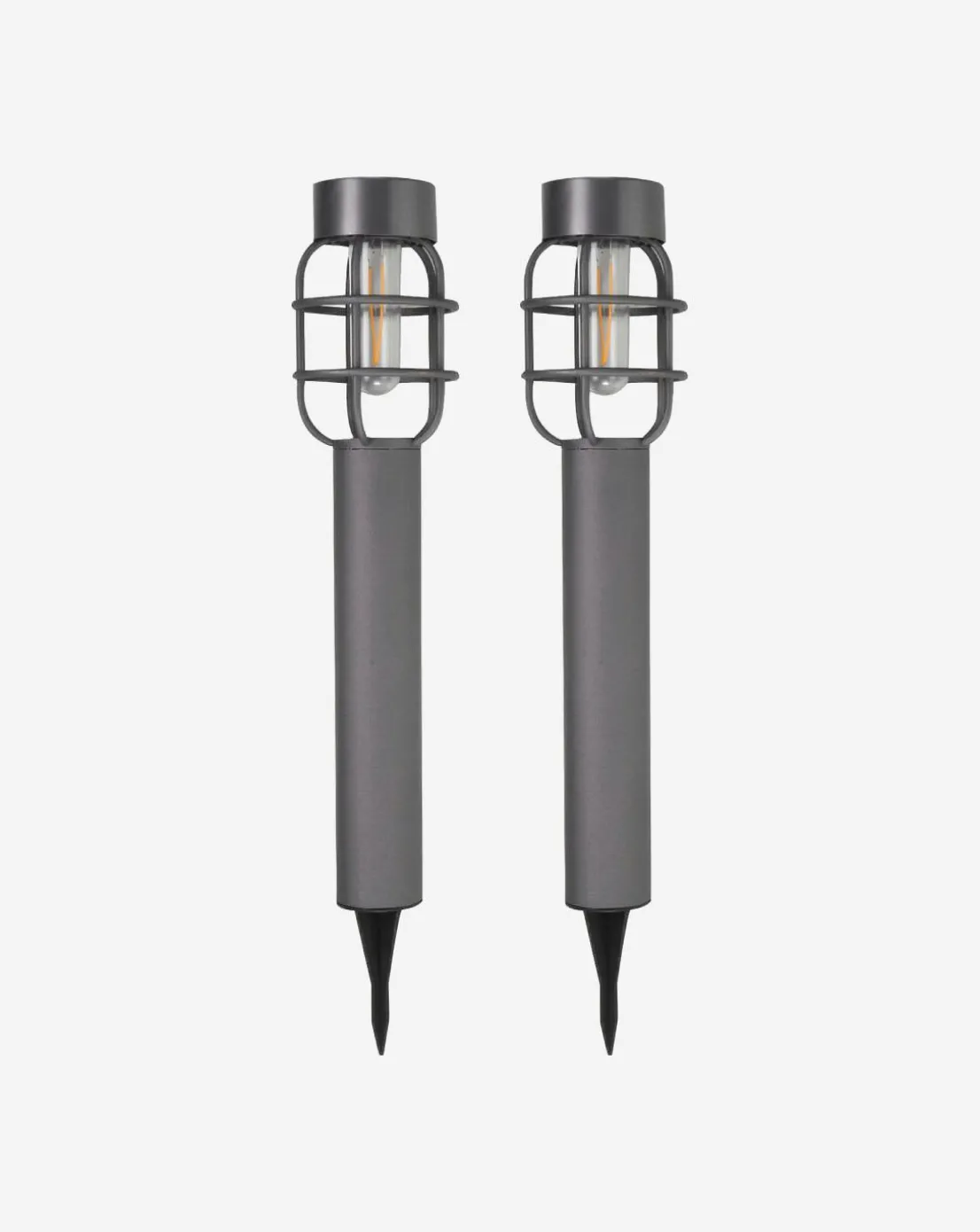 Pair of Grey Caged Solar Powered Stake lights. These have a powder coated matt finish and a 15 lumen output at full charge. Each stake has a built in solar panel on top, which charges in direct sunlight. Automatically adjusts brightness according to the amount of daylight received during the day, to provide light all year round.