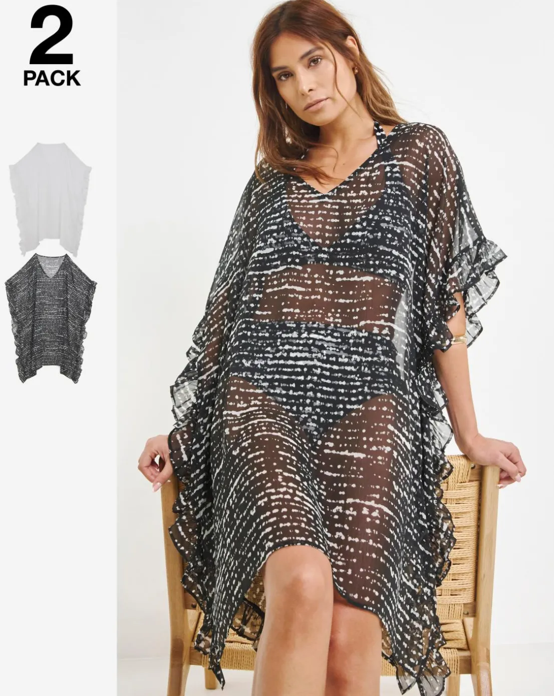The perfect 2 pack beach kaftan this season! This lightweight spot & white kaftan with a loose fit for extra comfort. Pair with our matching swimwear for the ultimate beach look. Length: 32 inch.