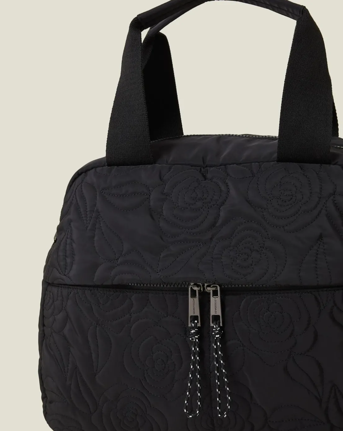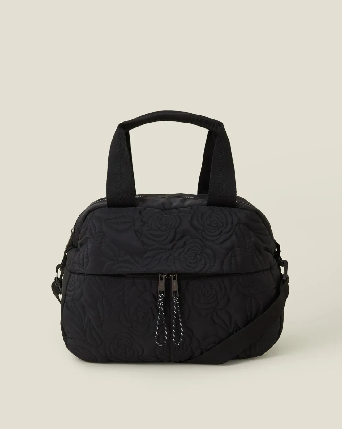- The perfect size for sleepovers or weekends away, this travel bag is decorated with fun, floral quilting on the front. Fastening with a top zip, it also features two front zip compartments, an interior zip pocket, two sturdy handles and an adjustable shoulder strap.