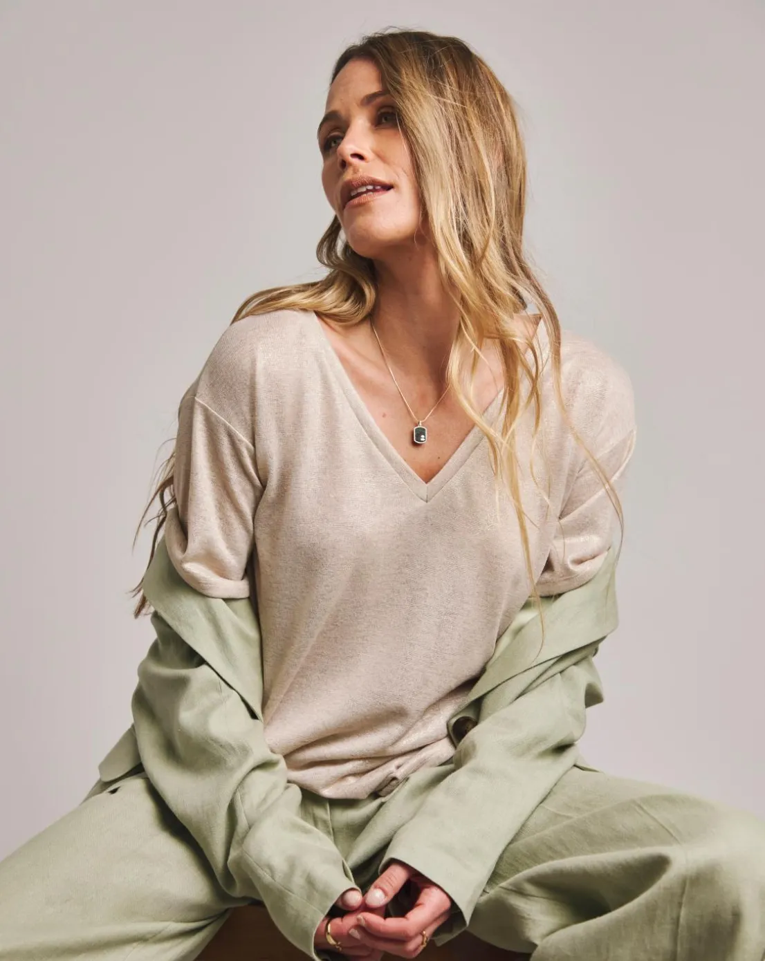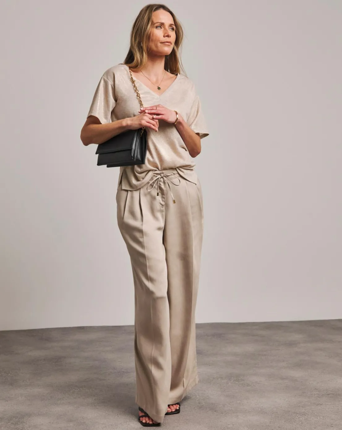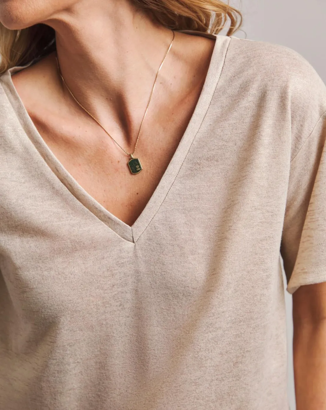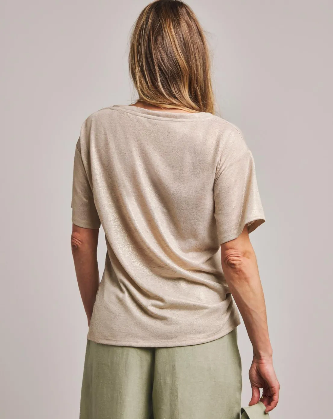 This Anthology T-shirt features a v-neck and short sleeves. The gold, textured jersey is made with 100% Cotton making it the perfect comfortable, stylish piece.
