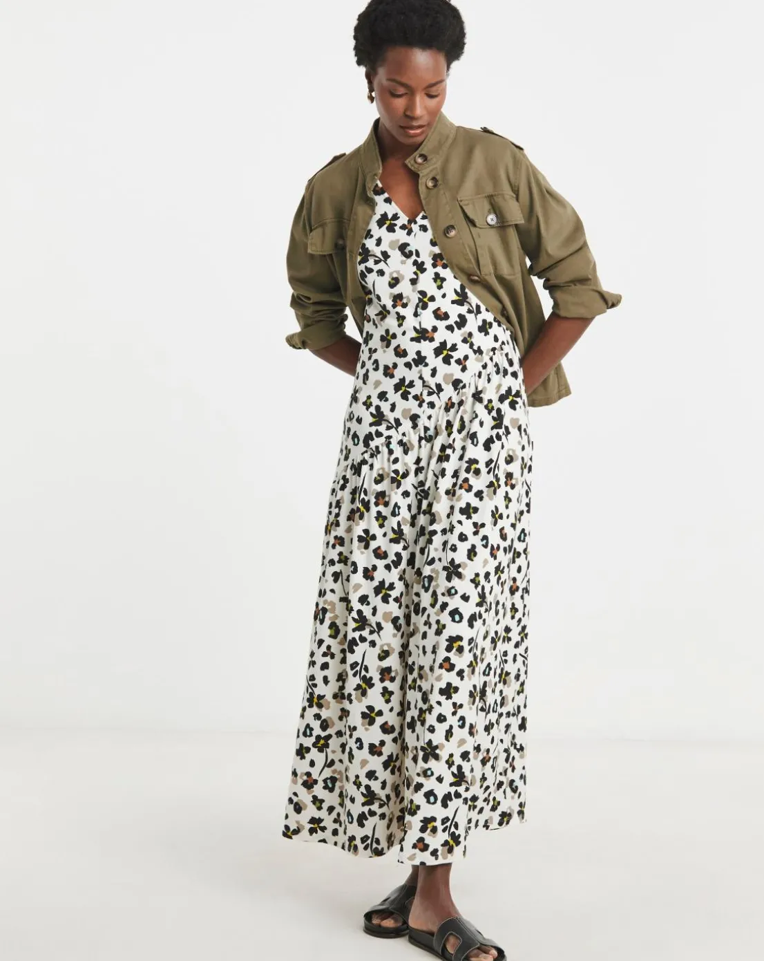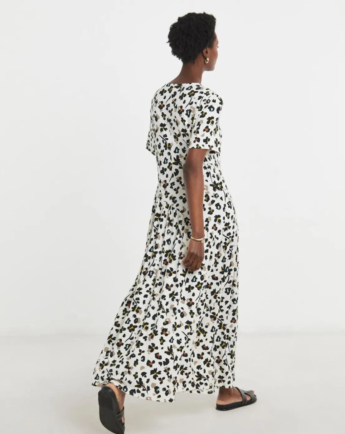 Our excellent value soft touch jersey asymmetric seam dress is back and has been redesigned in a simple ditsy floral print. The dress features short sleeves, V-neckline, asymmetric seam along the swing and maxi length of 50 inches.