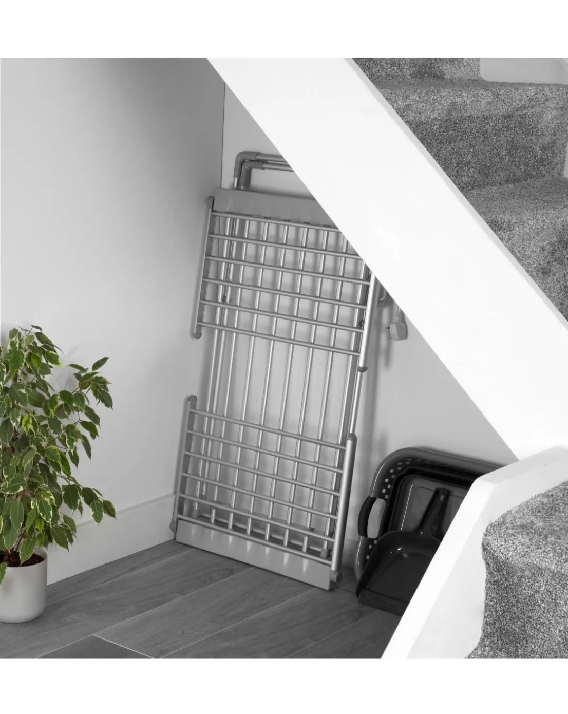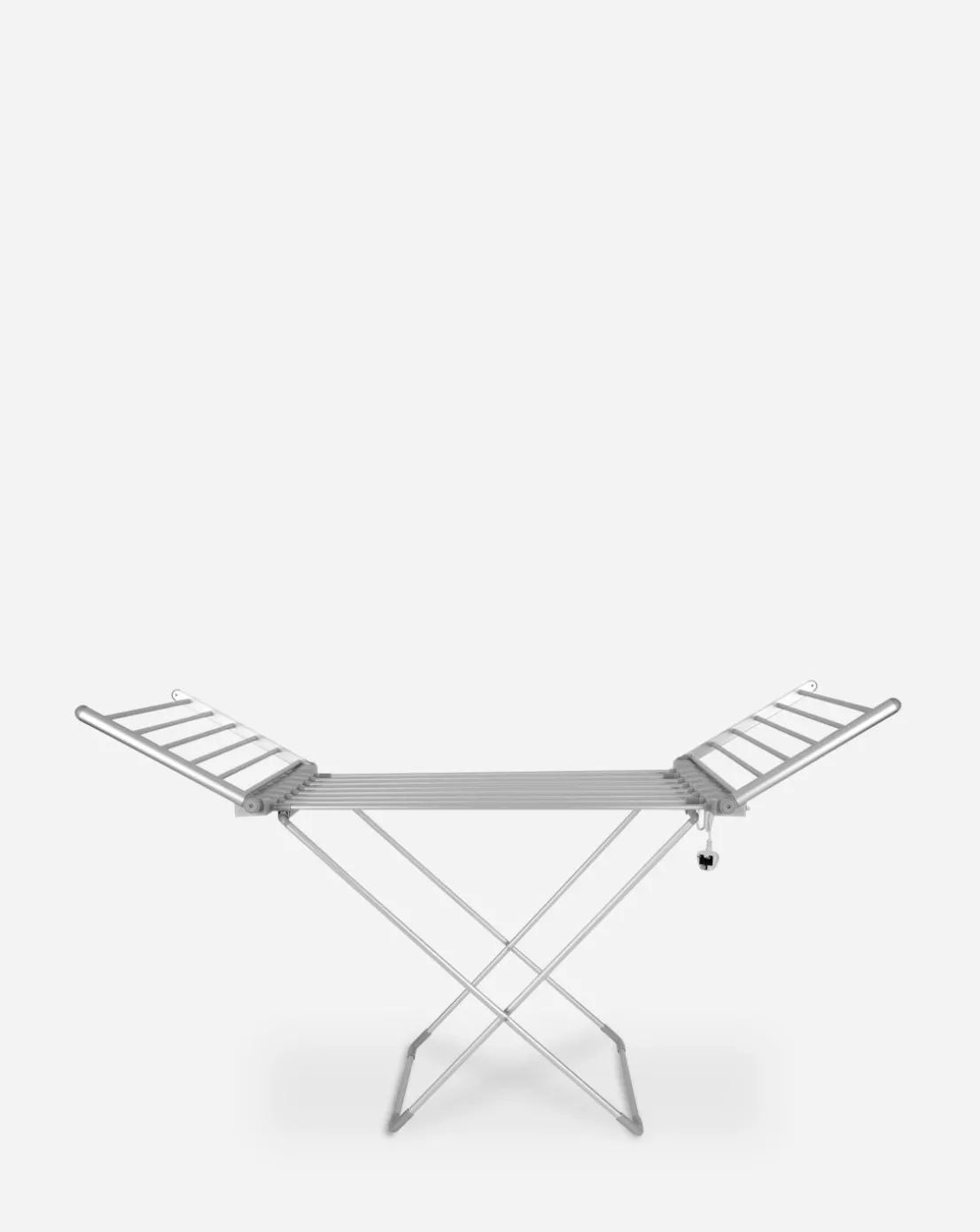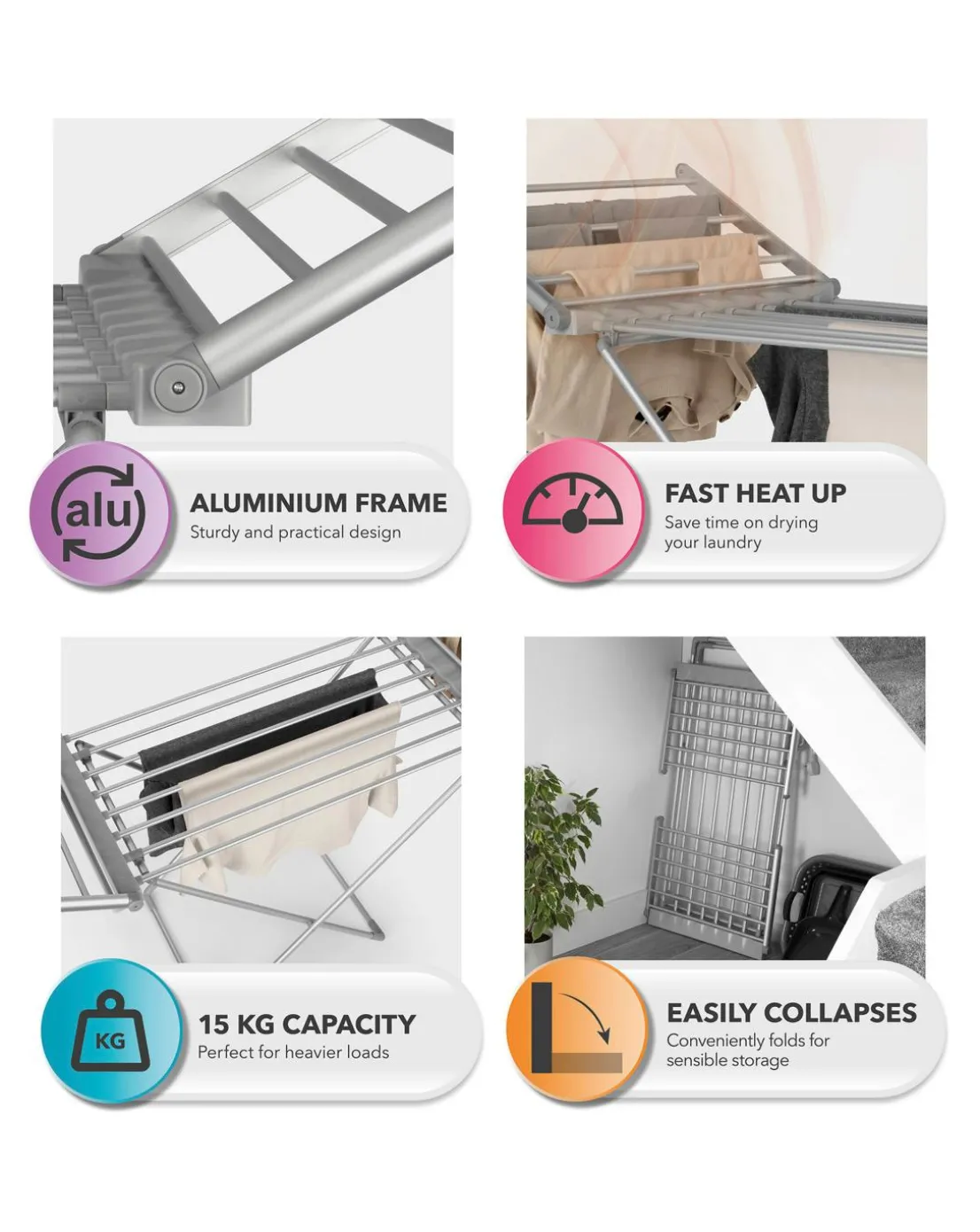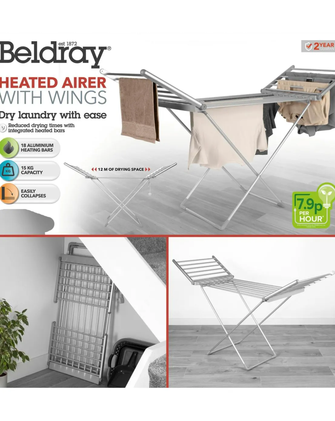 Dry your laundry efficiently with this Beldray heated airer with wings. Conveniently folding down for compact storage, this easily collapsible drying rack has 18 heating bars with 12M of drying space, perfect for drying your whole load. The sturdy aluminium frame can hold up to 15kg of washing and the fast heat up time ensures you save time on drying your wet clothes, bedding, and more. This practical airer is the perfect solution for slow indoor drying and to cut down on tumble dryer costs.Costing only 7.9p per hour to run, this heated airer with wings from Beldray is the perfect alternative to costly tumble drying.Large enough to handle a full load of washing, this electric clothes drying rack has 18 heated bars with 12 metres of drying space.’
