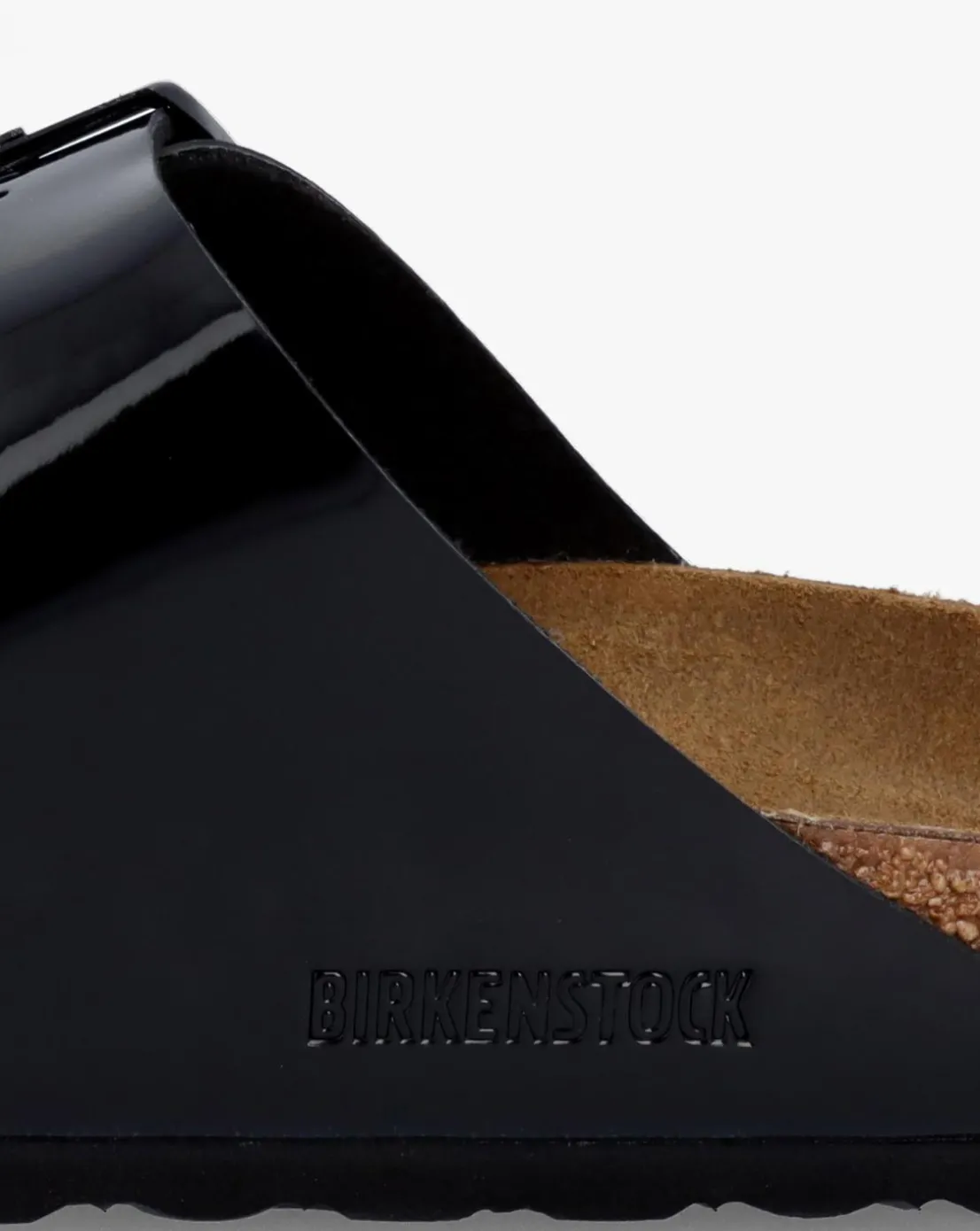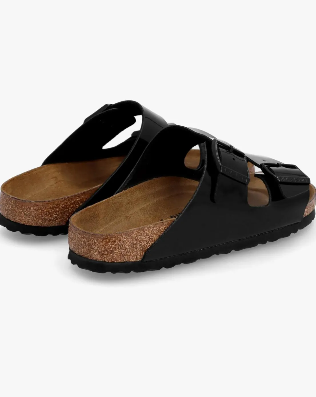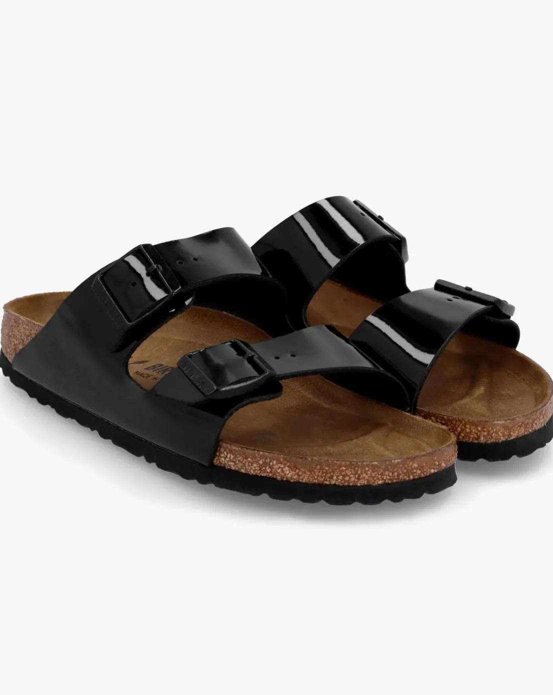 - The Birkenstock Arizona Birko-Flor Black Patent Two Bar Mules are a Summer staple style. A classic crafted from Birkenstock’s signature Birko-Flor in patent, leather insoles and features a natural cork foot-bed that has been contoured to conform to the shape of your foot with arch support and an extra layer of cushioning for optimum comfort, finished off with an EVA sole. An easy to wear slip on mule featuring two strap upper with logo buckle fastening. Classic Birkenstock branding completes the design.