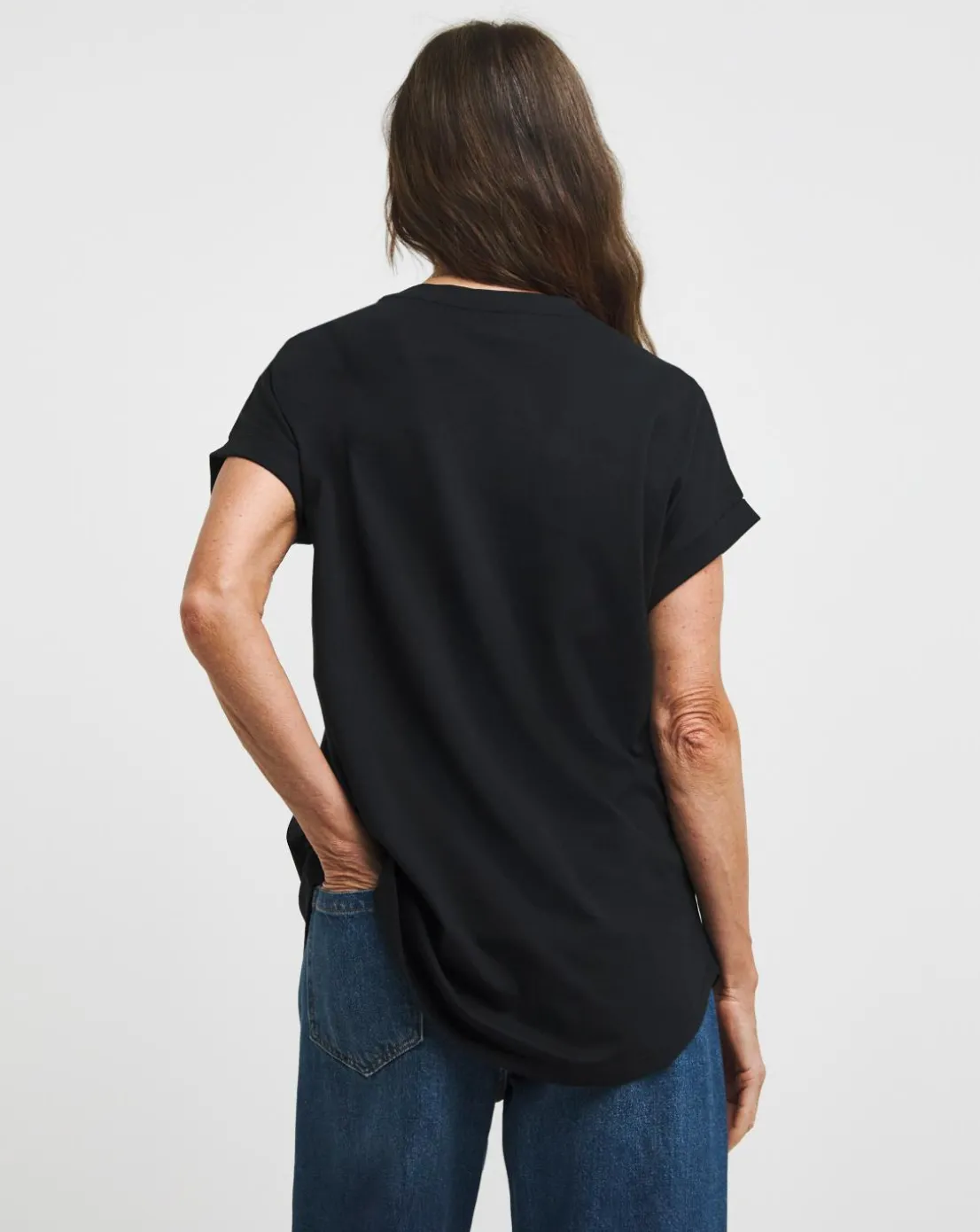 This black longline t-shirt is an an essential item in your capsule wardrobe. With drop sleeves and a curved hem, it’s perfect for your everyday, stylish look.