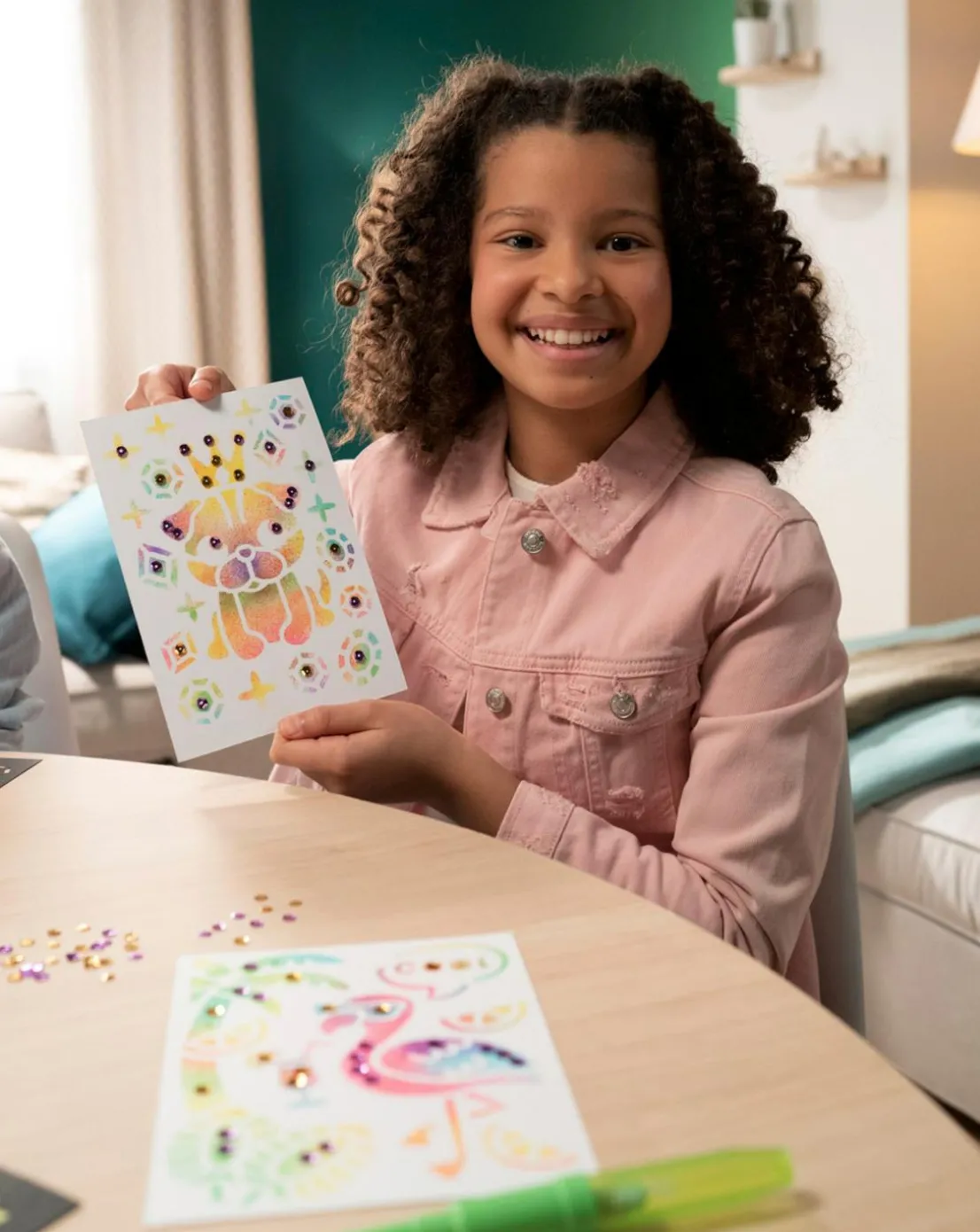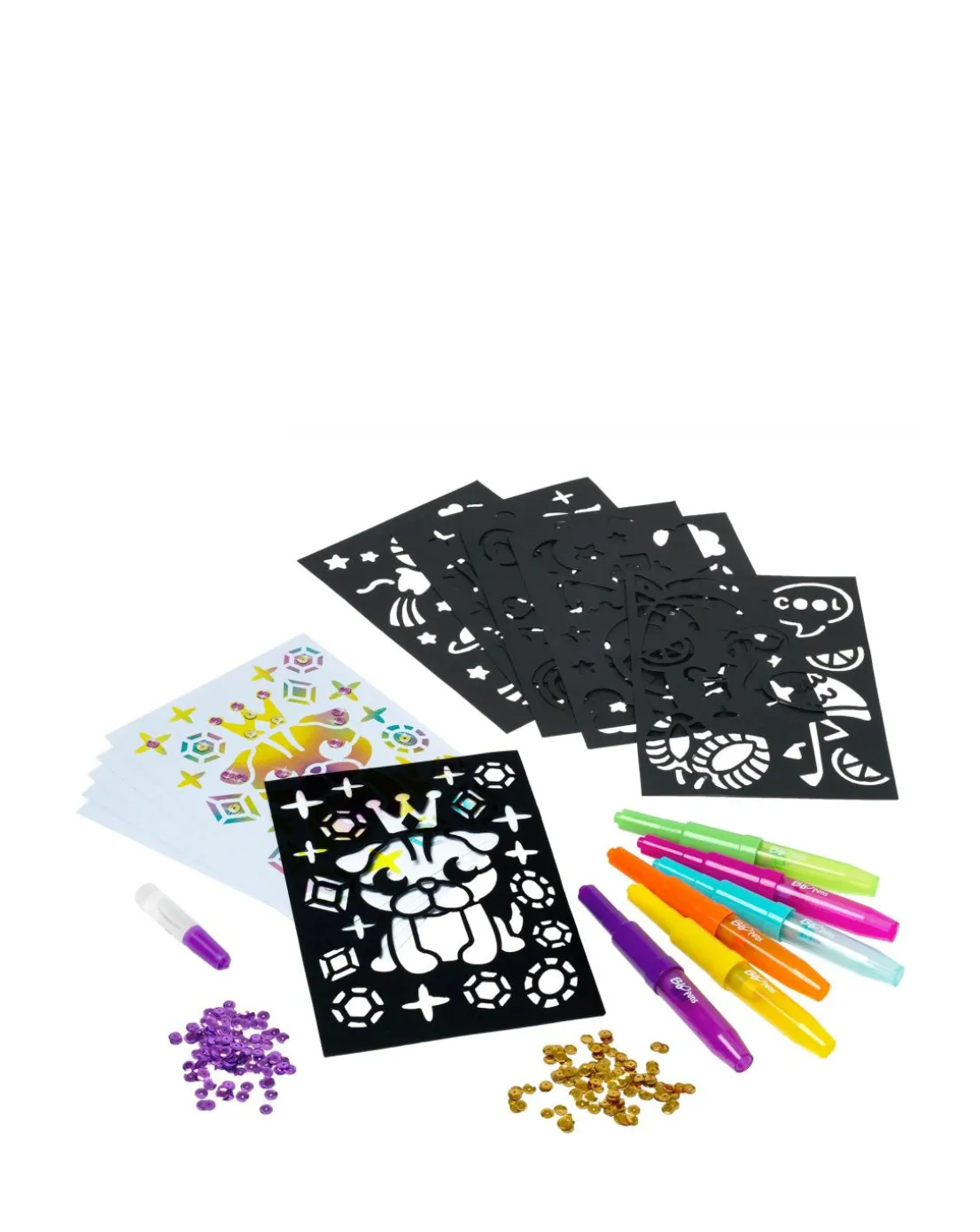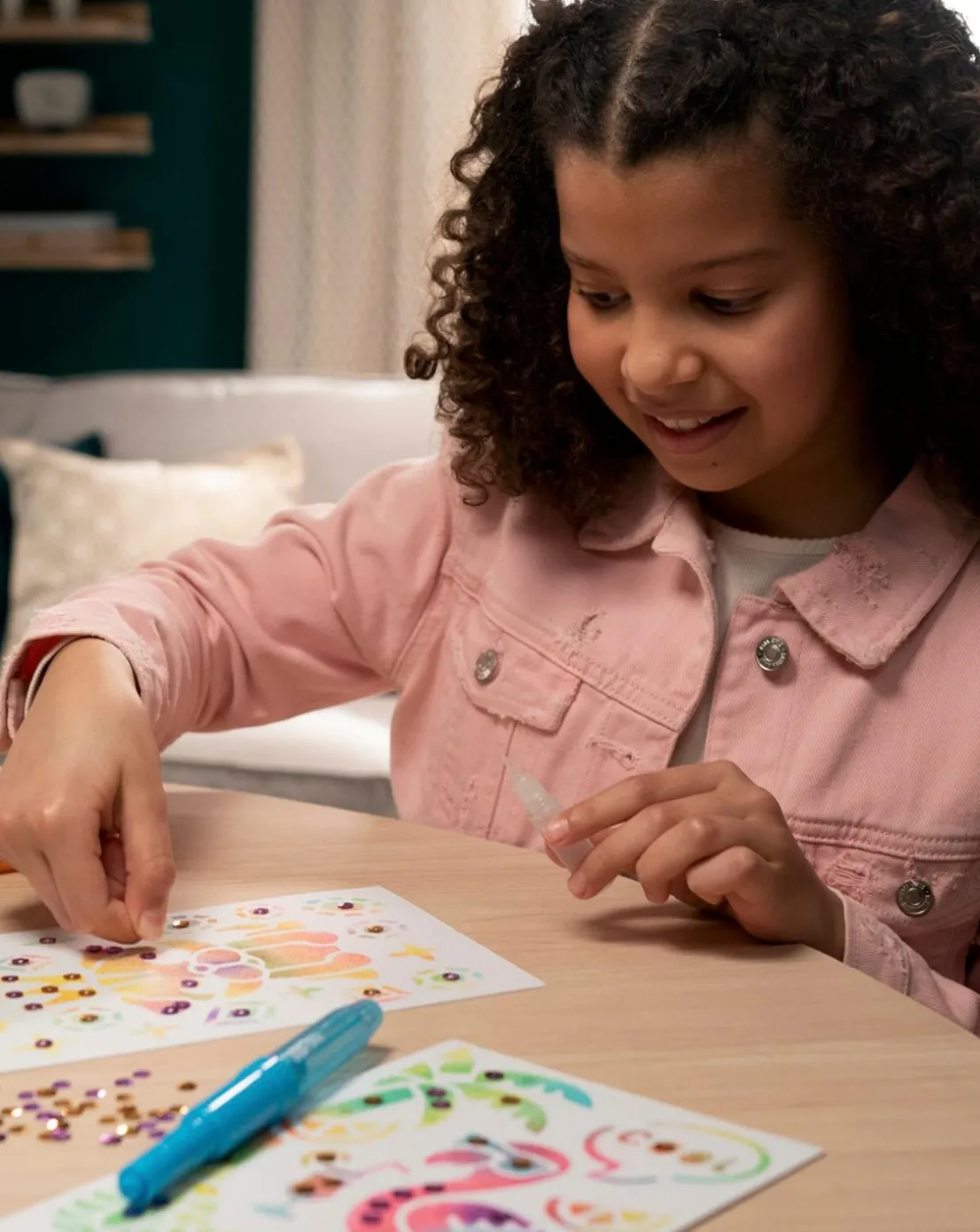 Kids love BLOPENS as they can create fantastic pictures with amazing airbrush style effects. Just put a stencil on a sheet of paper, blow in the pen and see your drawing appear! Blow in lines and circles as well as blowing harder and softer for different effects. Then use the same pens and sequins to add extra detail for a perfect finishing touch! BLOPENS caps are washable and interchangeable. With 200 sequins included, 6 BLOPENS, and 6 stencils you can make really pretty pictures that really sparkle!