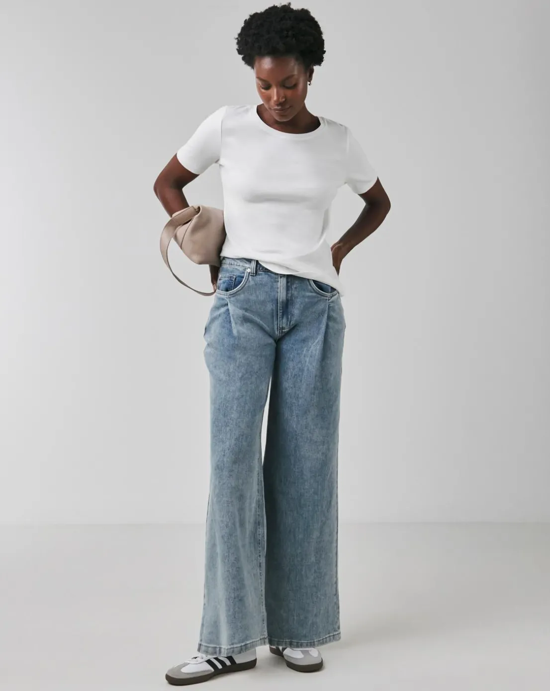 Update your wardrobe with these stylish wide leg jean. Featuring a pleat detail, belt loops and front pockets.