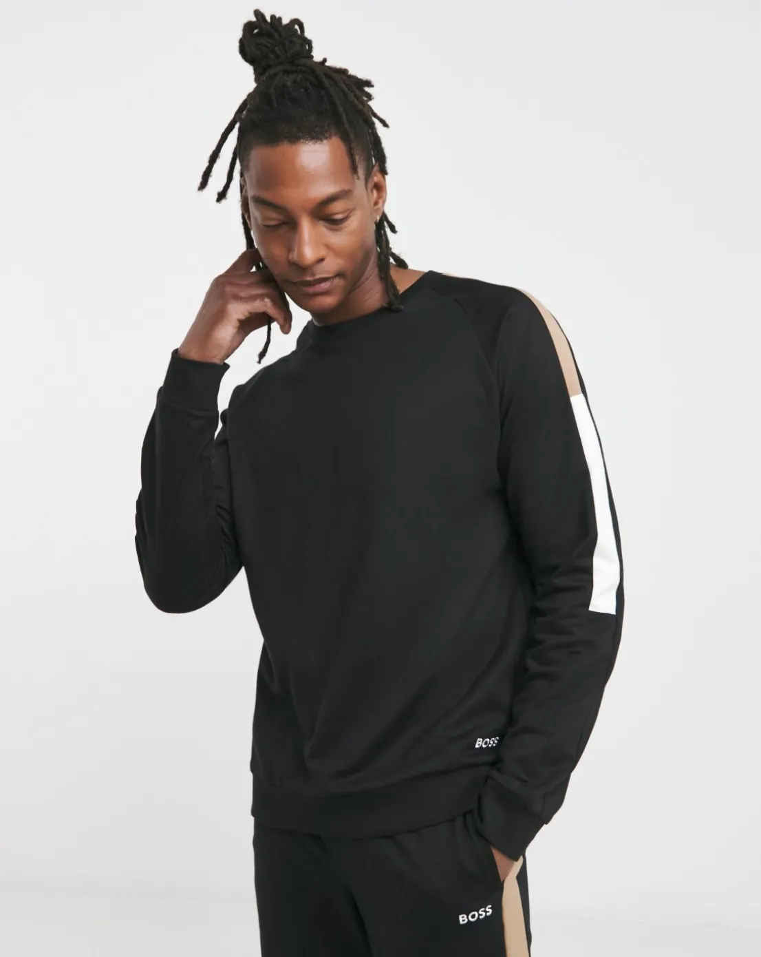 BOSS Iconic Lounge Sweatshirt in black. Model wears size M.