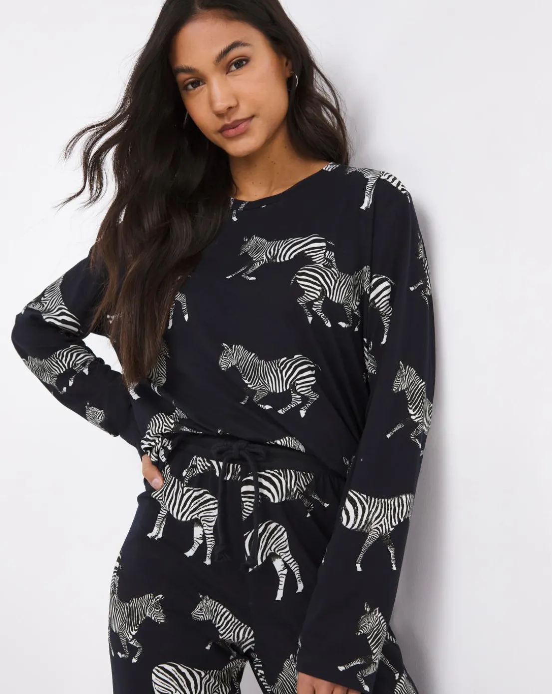 Supersoft touch jersey knit long pj set, made from a sustainable recycled polyester, in an all-over zebra print. Long sleeved round neck pyjama top and elasticated waist pyjama bottoms.