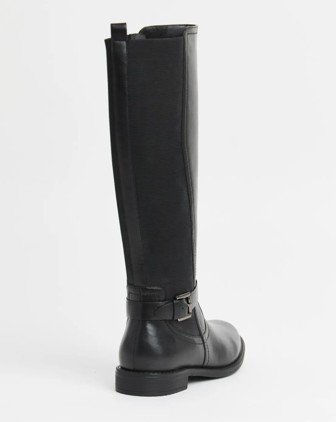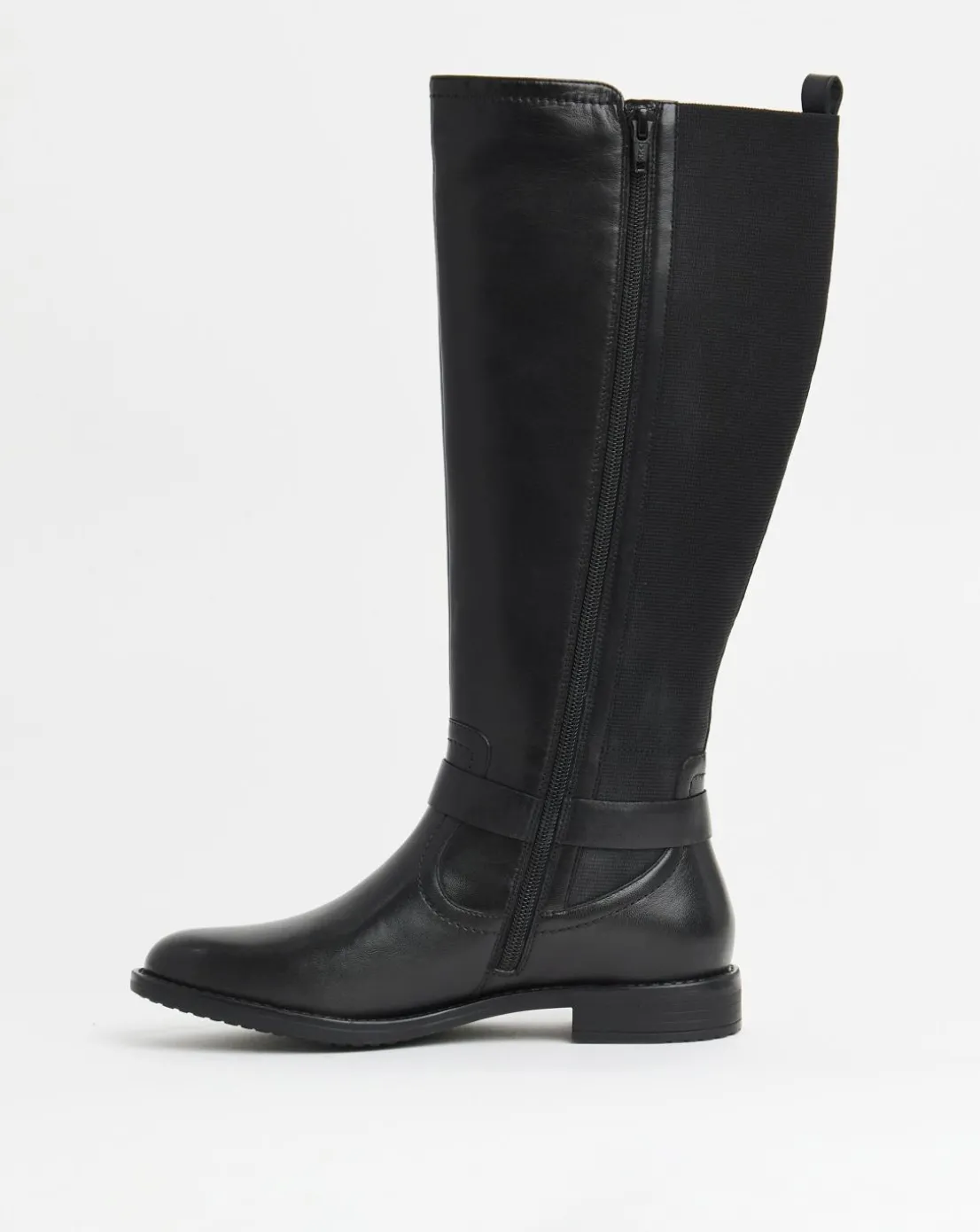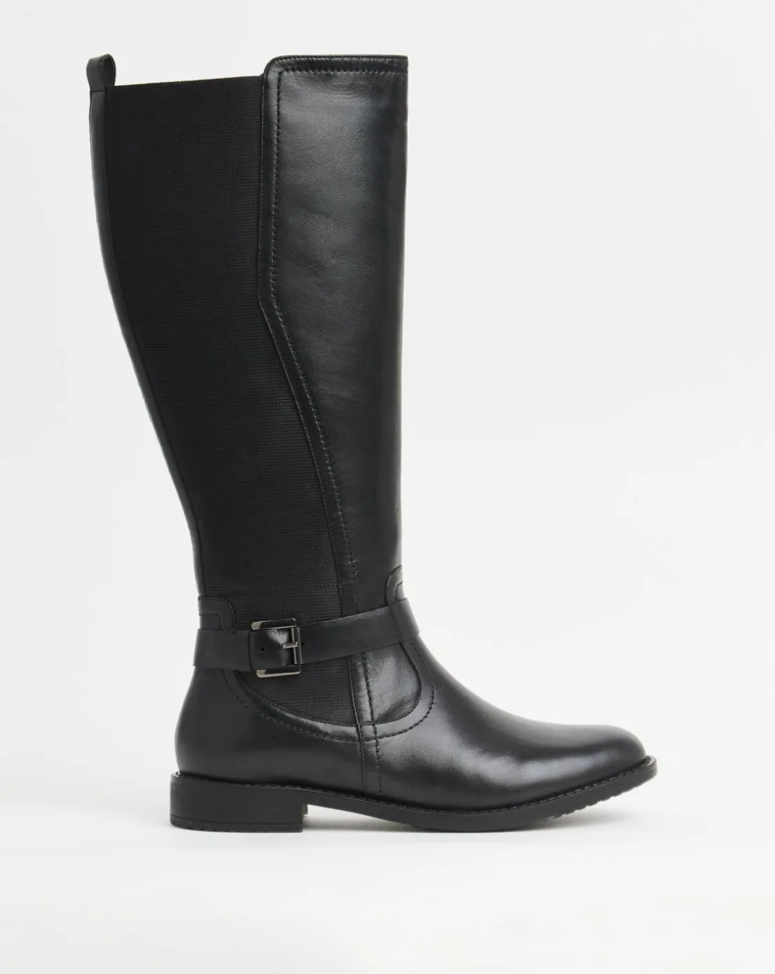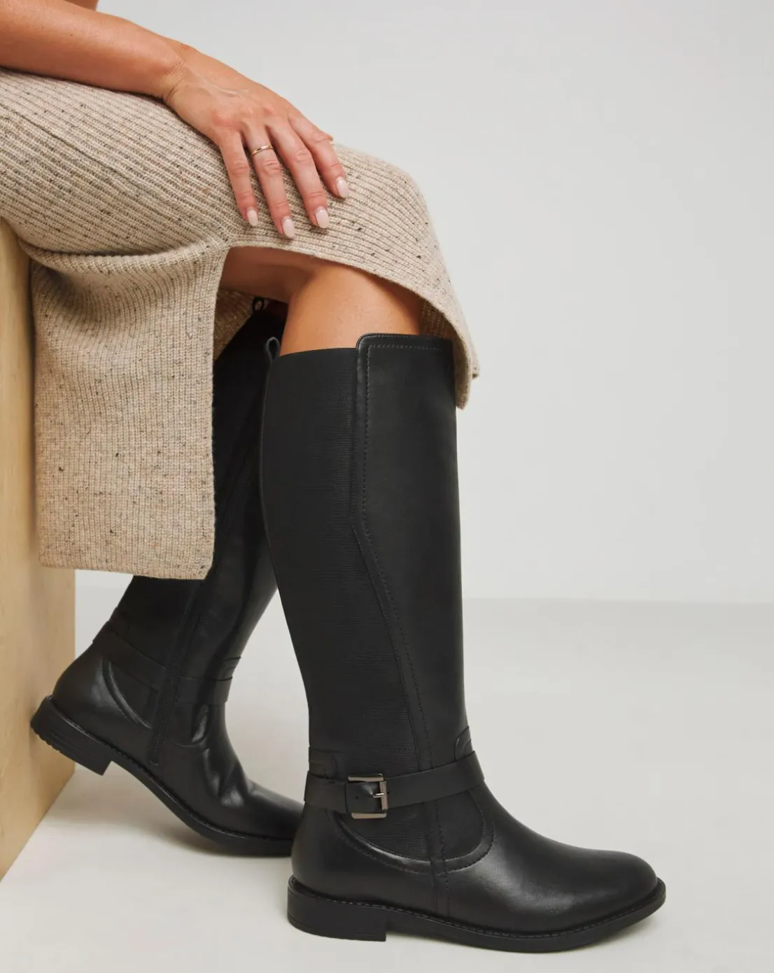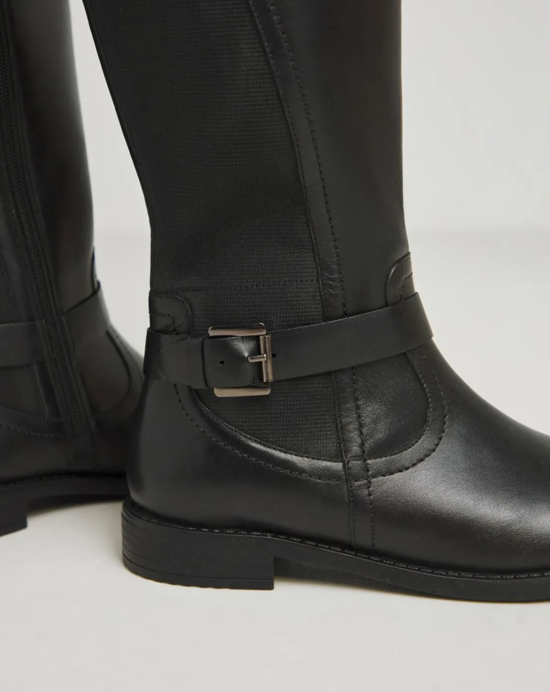 Our new sleek riding boot features a leather upper, full stretch back panel and buckle detailing. An ideal everyday boot for the colder weather.