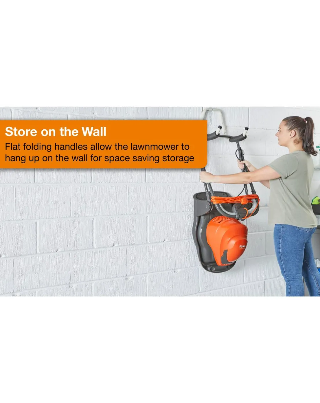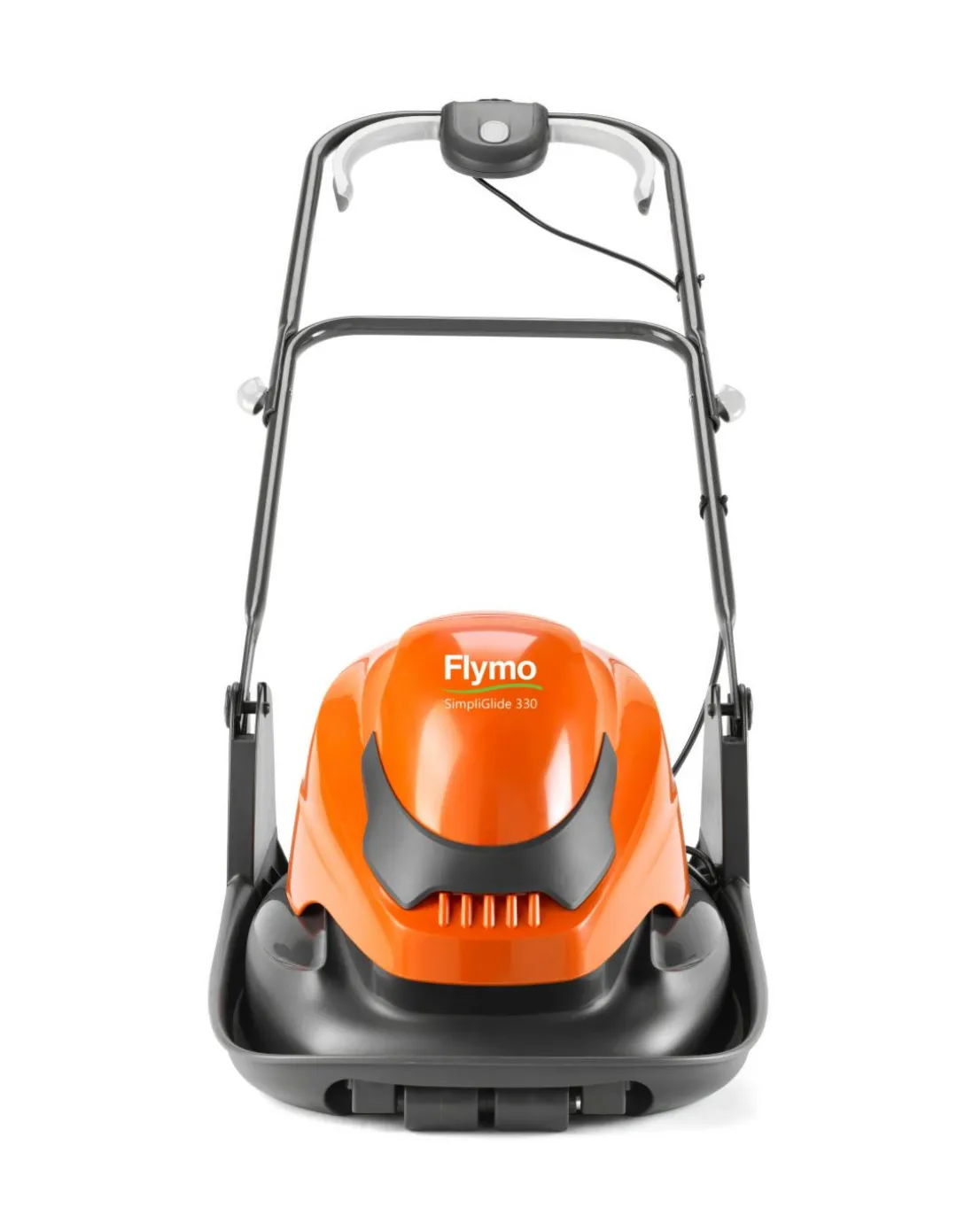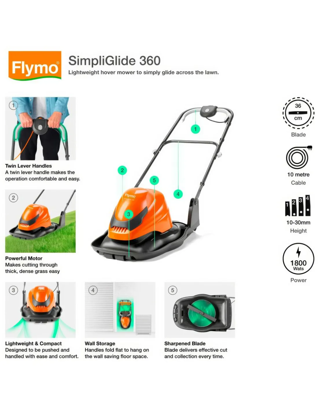 Designed for small to medium gardens, the Flymo SimpliGlide 360 is a 36cm electric hover non-collect lawnmower with a powerful 1800W motor. Highly manoeuvrable as it floats on a cushion of air whilst cutting the grass. Equipped with dual lever handles, can easily fold down for storage and be wall-mounted.