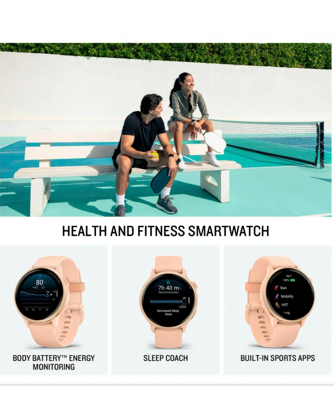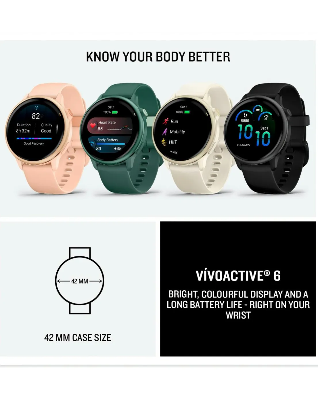 Understand your body better with Vivoactive 6, the health and wellness smartwatch. Featuring a bright AMOLED display and up to 11 days of battery life, this GPS smartwatch is purpose-built with essential health and fitness features. Body Battery energy monitoring helps you keep your energy levels in check with personalised insights based on sleep, naps, stress, workouts and more. Improve the quality of your sleep with personalised sleep coaching and nap detection plus even more details such as HRV status (data presented is intended to be a close estimation of metrics tracked). During the day, keep your activities fresh with more than 80 built-in sports apps, plus fitness features such as daily suggested workouts for walking to help you reach your goals. When paired to your smartphone, Vivoactive 6 makes it easy to receive texts, emails and other smart notifications right from your wrist. Plus, enjoy connectivity features such as music storage, Garmin Pay contactless payments (with a supported country and payment network) and more.
