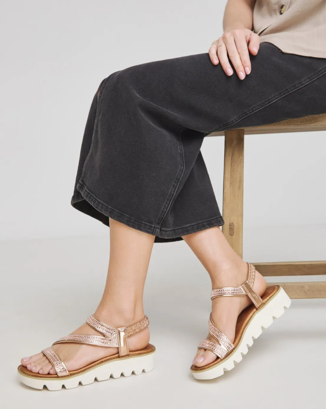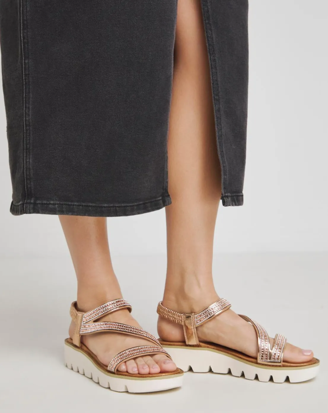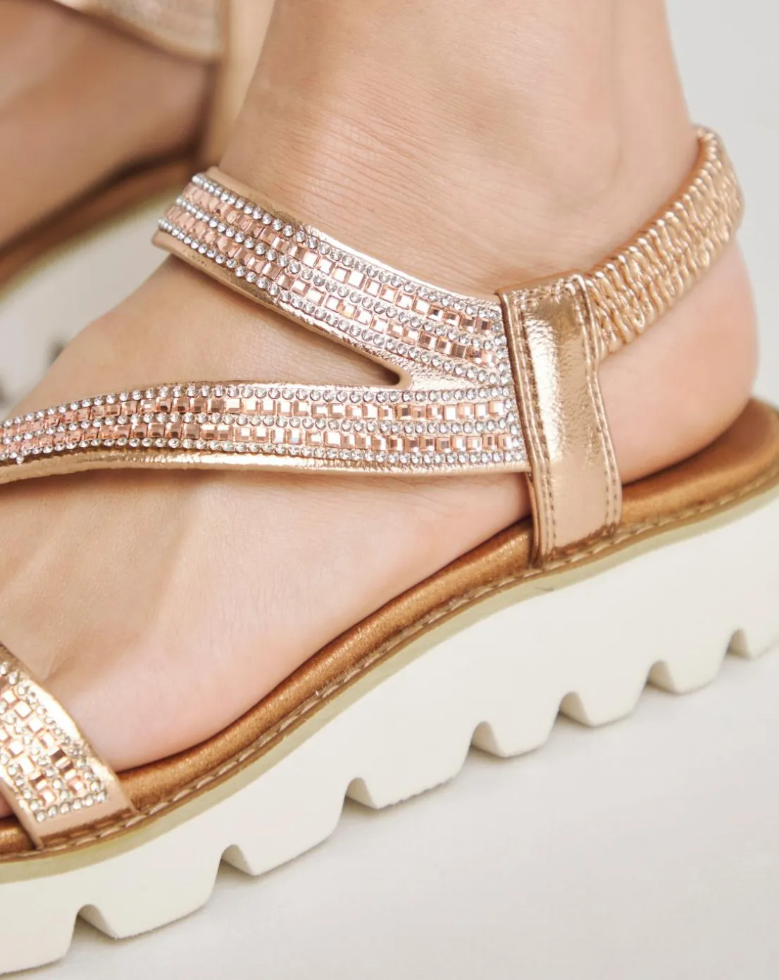 Ideal for everyday, evening, and holiday attire, our fantastic Vegan-friendly sandal, Fresco, adds a touch of glitz and glamour to every outfit! Adorned with faux diamante-trimmed upper straps and a secure, elasticated stretch heel strap, it ensures both a stylish appearance and a comfortable on-foot fit. The soft cushioned footbed provides underfoot comfort, while the super lightweight construction and chunky outsole make it perfect for packing in your suitcase when traveling