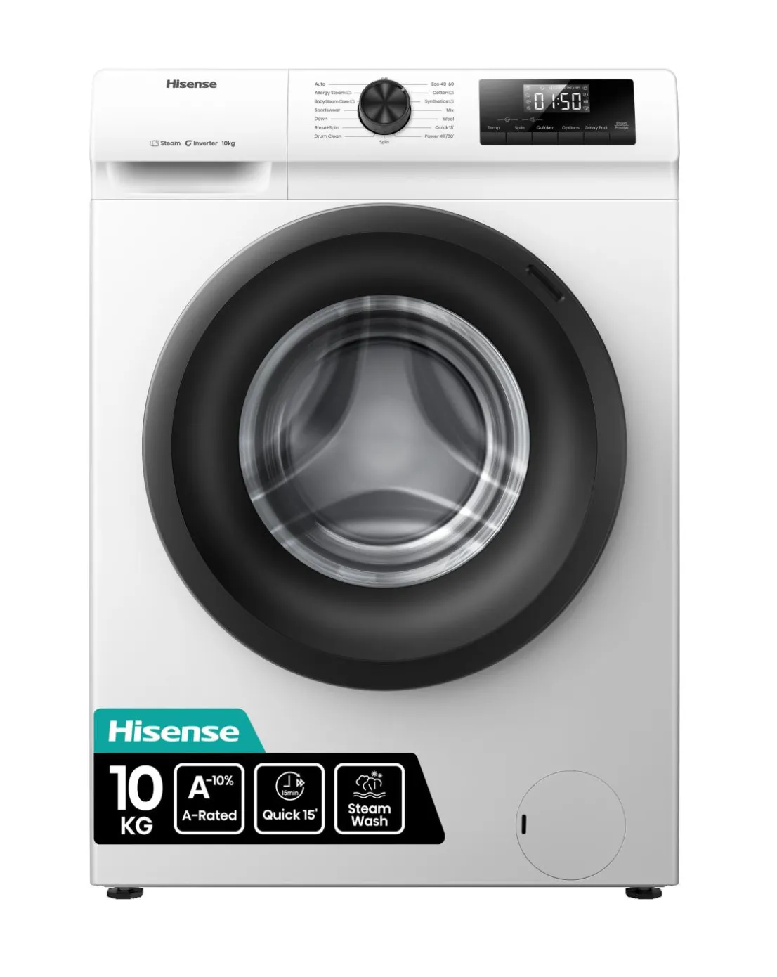 The Hisense 1 Series WF1Q1041BW Washing Machine offers a perfect blend of efficiency and convenience for your laundry needs. With a 10kg capacity, its ideal for families and busy households, while its A-rated energy efficiency helps reduce both your energy bills and environmental impact. The washing machine features Quick Cycles of 30 or 49 minutes, perfect for those in a hurry and a Quick 15 Cycle for when you need your clothes done in just 15 minutes. The Steam Wash function eliminates wrinkles and refreshes clothes, making ironing easier. Additionally, the Allergy Care programme remove allergens and bacteria, offering a safe wash for sensitive skin. With 15 Wash Programmes to choose from and a Durable Inverter Motor for quiet, long-lasting performance, the Hisense 1 Series WF1Q1041BW delivers exceptional cleaning power while saving you time and energy.
