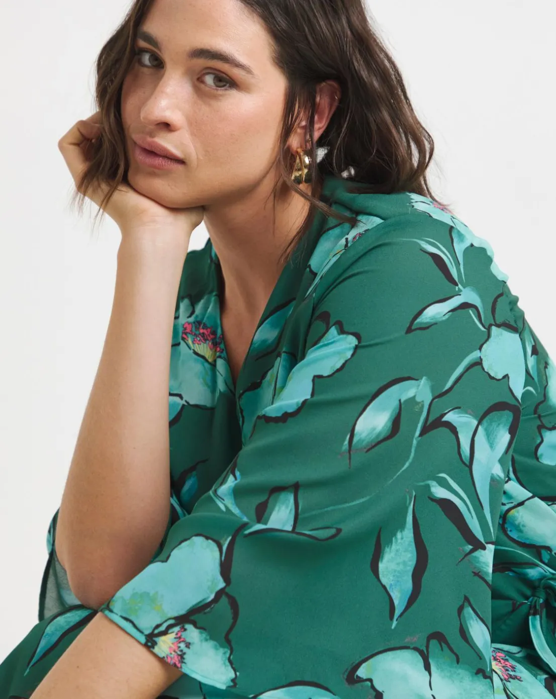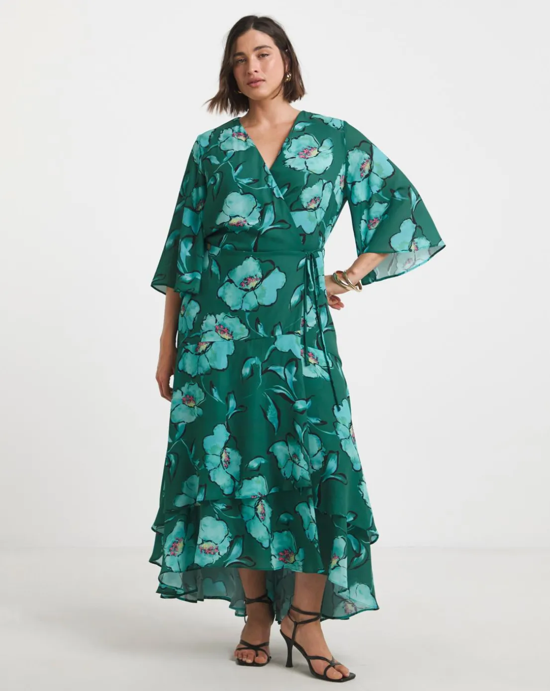This stunning Joanna Hope dress features a striking green floral print. Designed with gorgeous ruffle sleeves and hem and comes in a wrap shape with a functional tie waist. The perfect spring occasion dress,