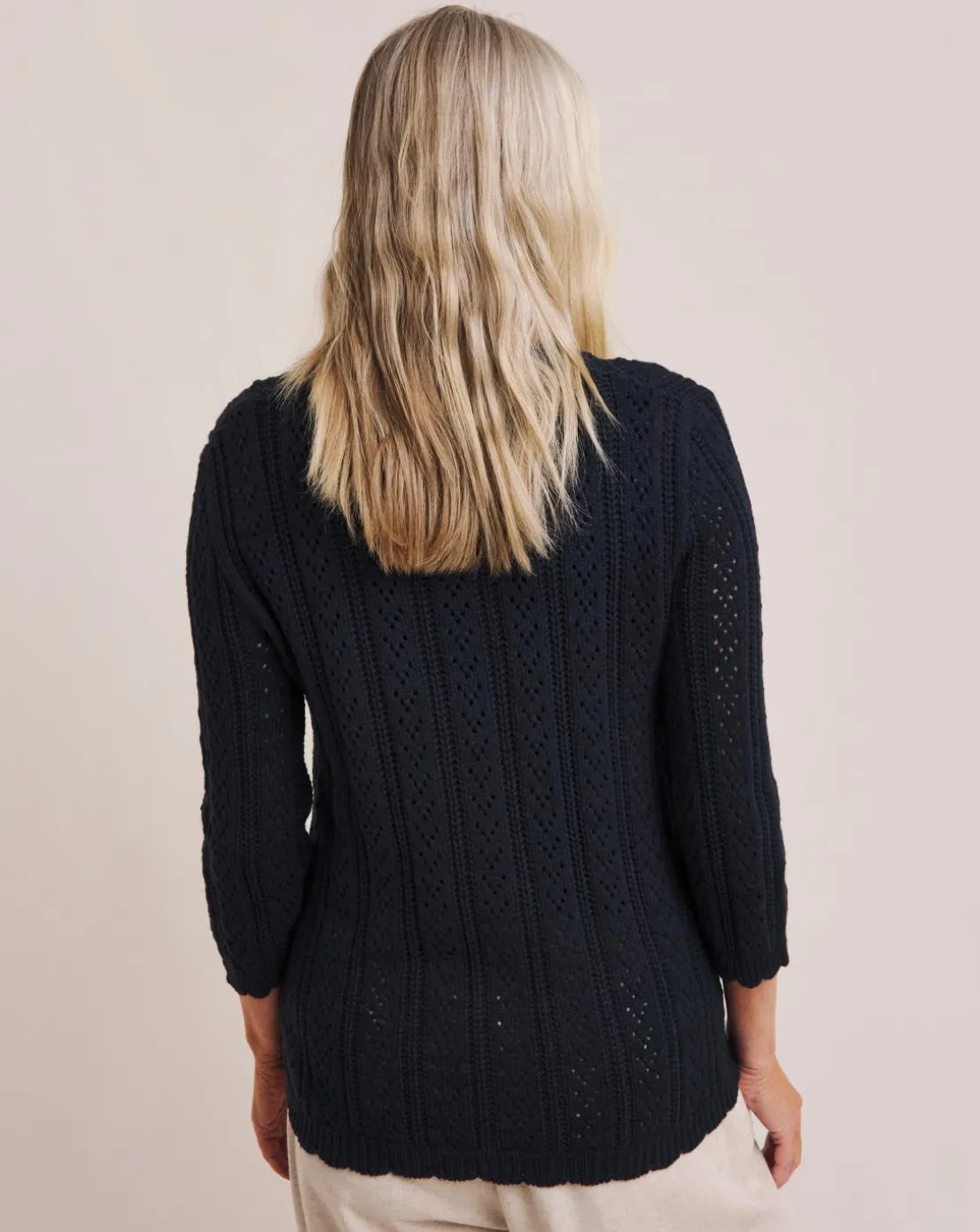 Everybody’s needs this light layering piece in their wardrobe. Featuring soft cotton acrylic yarn, three quarter sleeves, scallop detail, regular fit.