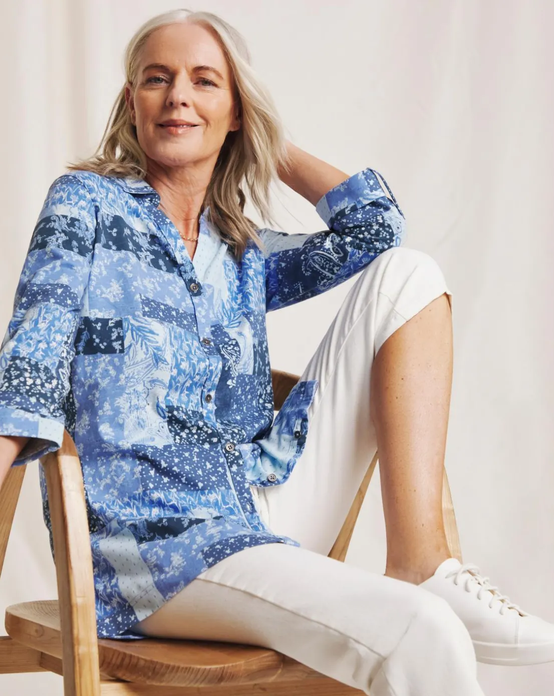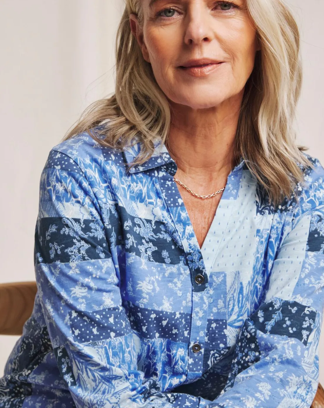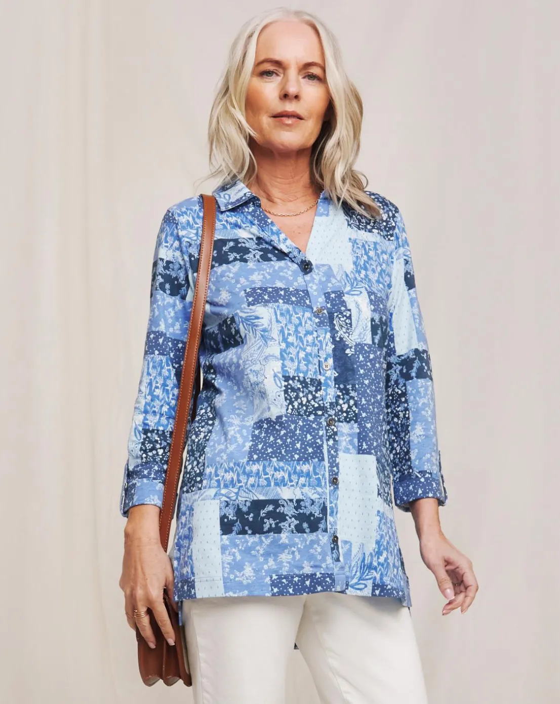 This longline cotton jersey button up shirt features a pretty pathwork print, three quarter length rolled up sleeves and a flattering v neckline. Made with BCI cotton; by choosing our cotton products, you are supporting Julipas investment in Better Cottons mission. This product is sourced via a system of mass balance and therefore may not contain Better Cotton.