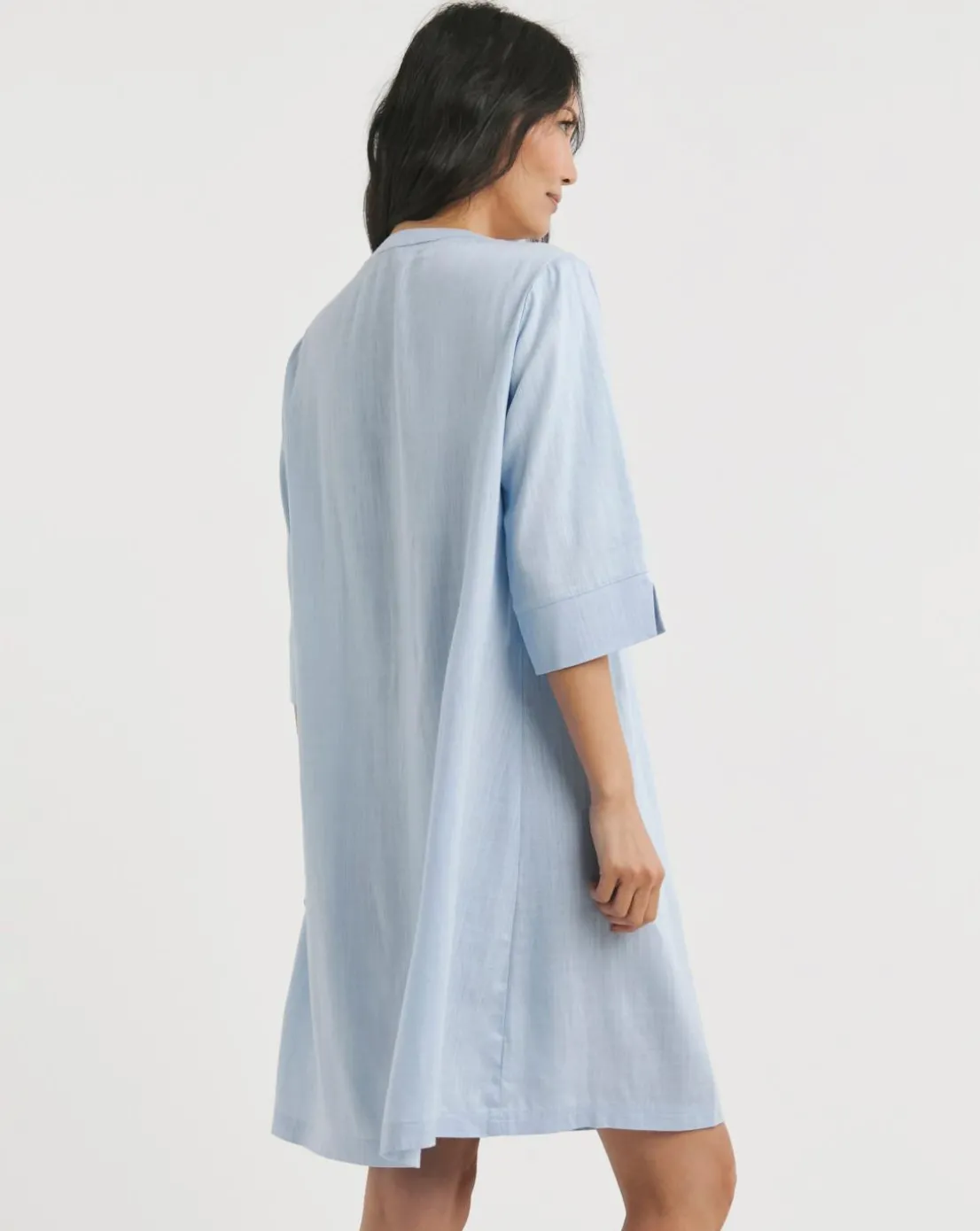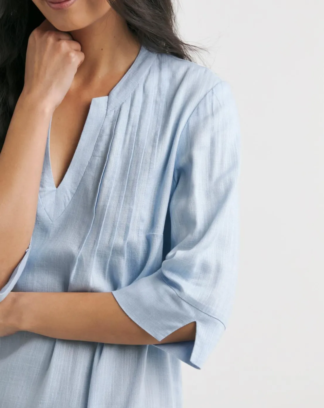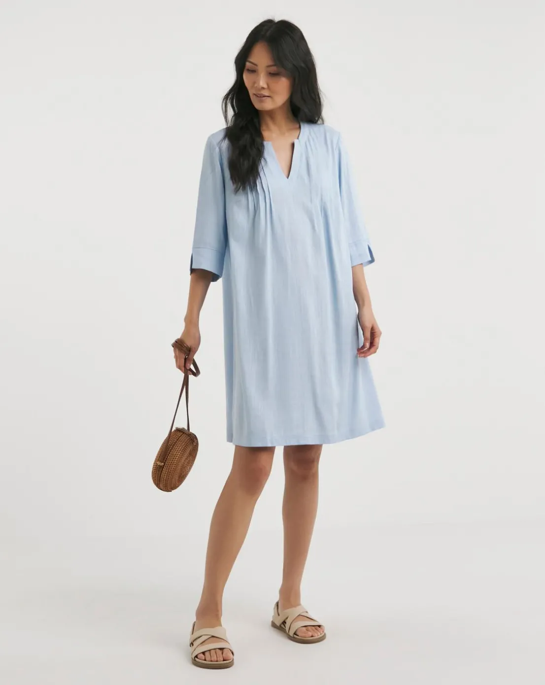 This pintuck shift dress with three quarter sleeves and a notch neckline is an easy thrown on piece for summer. Made from a light linen fabric its breathable and comfortable.