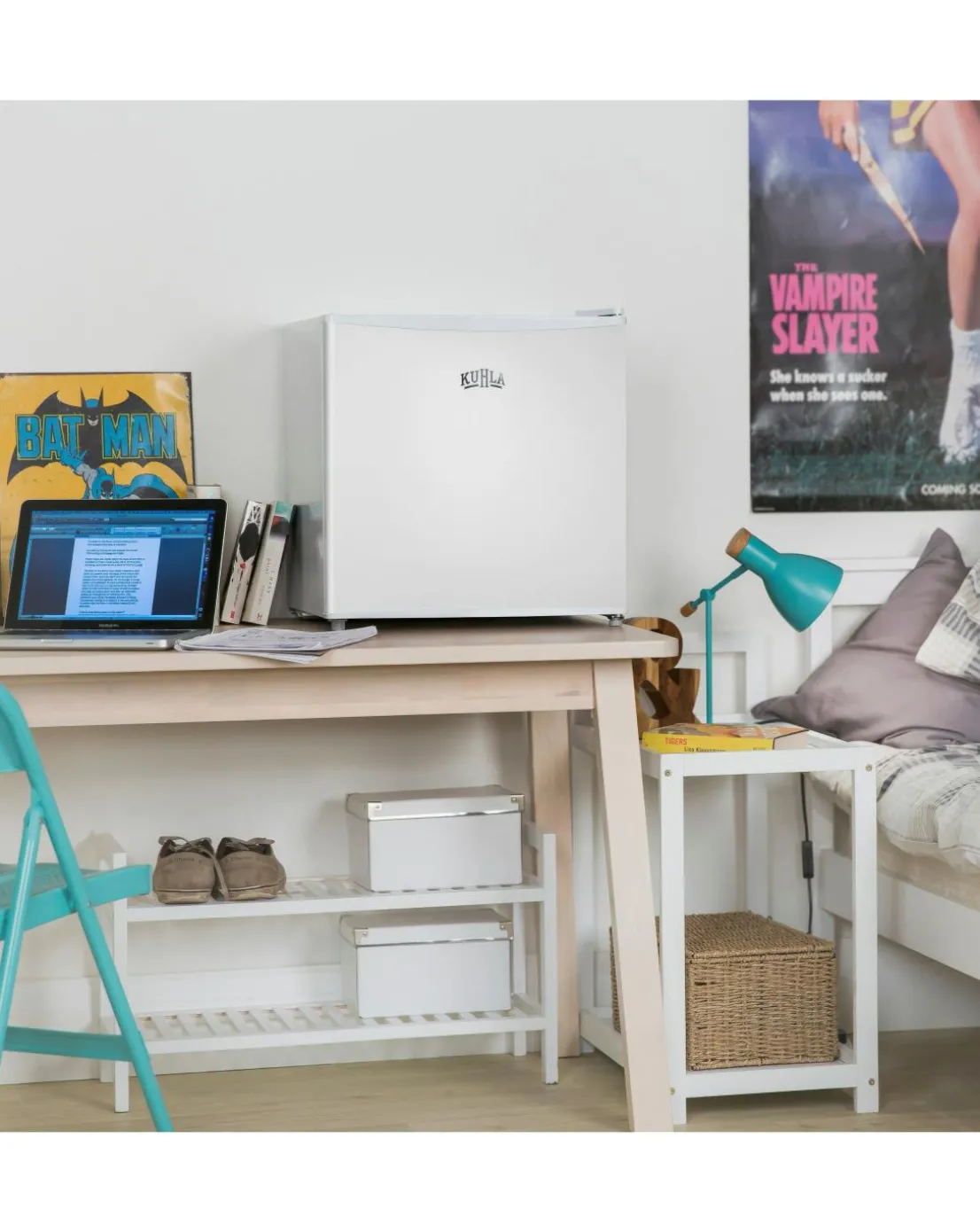 Brighten your home with this stylish design Kuhla mini fridge. Making a fun statement, the Kuhla mini bar fridge is great for keeping cold drinks and snacks close at hand, the perfect addition for your kitchen, utility, bedroom, playroom, office or even home bar. Practical, sleek, and fun, a spacious 45 litre capacity can easily store all your essential beverages and tasty treats. A bottle rack and a removable wire shelf offer versatile cold storage that you can tailor to your needs. Plus, there’s even an ice box compartment included for ice cubes or ice lollies. This modern, stylish and space-saving appliance even has a reversible door, giving you the option to choose which works best for your space. Ideal for students, teens and entertaining.