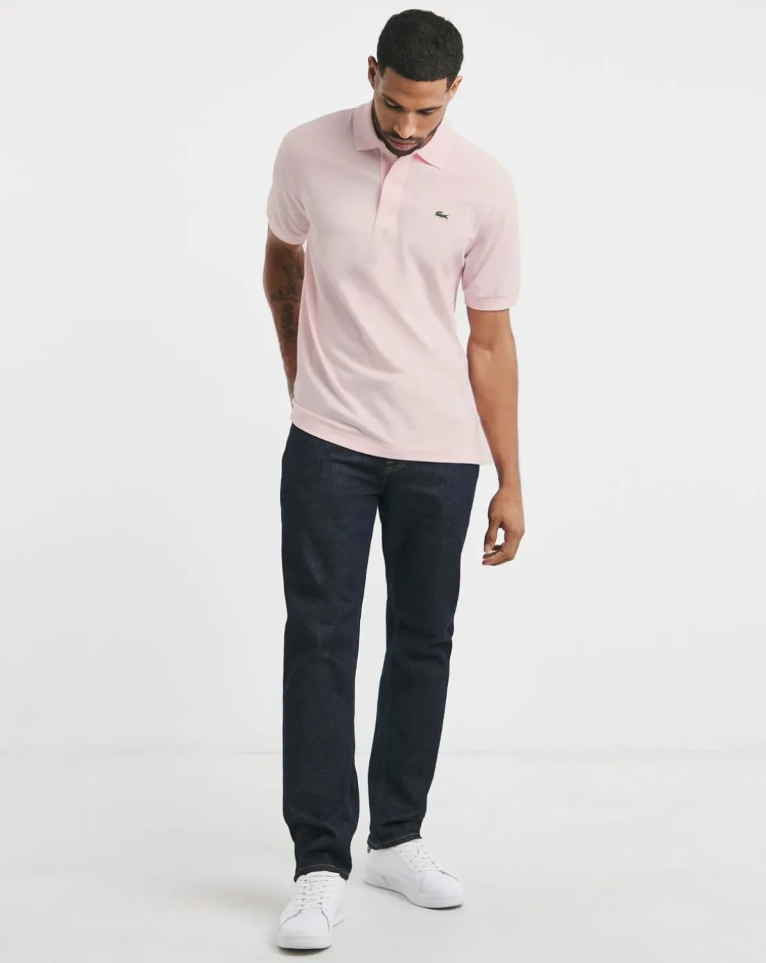 Lacoste Short Sleeve L.12.12 Light Polo, in pink. Made with the petit pique, Lacoste’s signature knit. Model wears size M.