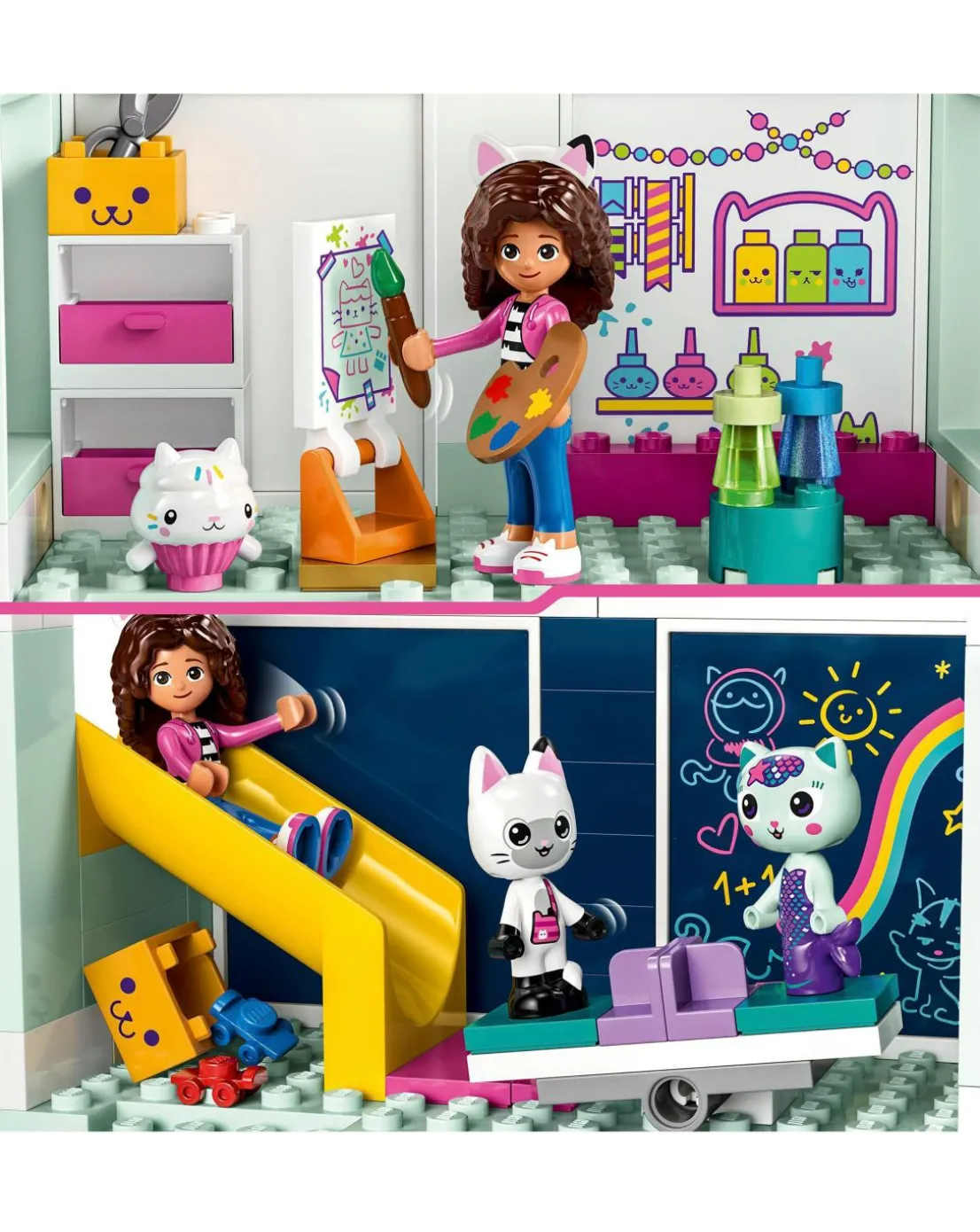 LEGO Gabby’s Dollhouse (10788) toy playset for girls, boys and kids aged 4+ years old is packed to the rooftop with activities and Gabby’s Dollhouse characters. Treat a fan of the DreamWorks Animation TV show to an 8-room house of their own. Gabby’s Dollhouse toy playset features 8 colourful rooms connected by a sliding lift, plus loads of Gabby’s Dollhouse accessories including a banana, berry, cupcake, cup, bowl, scissors, paint brush & palette, hairbrush, book, flower, microphone, guitar, saxophone and lots more. Fans can have fun building all the authentic details of Gabby’s Dollhouse then decide which room to play in first. For example, kids can bake in the kitchen, use a slide in the playroom, get creative in the art room, play piano in the music room, pamper themselves in the bathroom, take a nap in the bedroom or head to the rooftop for a party on the rotatable dance floor. Kids share their adventures with 4 popular Gabby’s Dollhouse characters from the show: Gabby, Pandy Paws, Cakey and MerCat. There’s a picture-story building guide, and the LEGO Builder app has intuitive zoom and rotate tools. A large Starter Brick ensures the building fun begins right away.