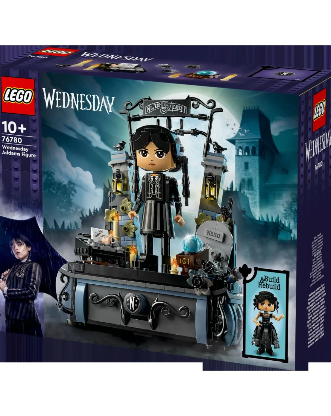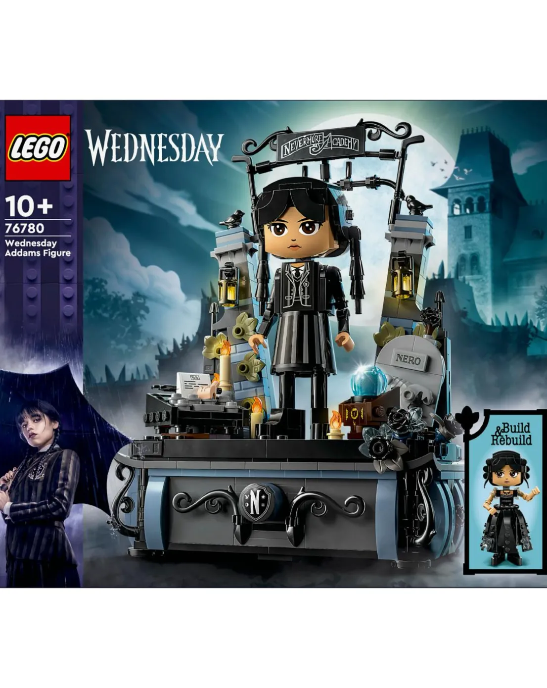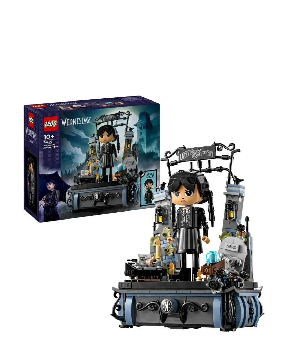 Mysteries and mayhem await kids aged 10 and over in the Wednesday Addams Figure (76780) set. This LEGO Wednesday gift set features a collectible, posable model with movable head, arms and feet, plus 2 faces and 2 outfits so the figure can be rebuilt. The set includes her loyal sidekick Thing, a stand with toy black dahlias and 2 hidden spaces to hold treasures like the Rave’N Dance dress or her uniform. There’s also the Nevermore Academy gate and Wednesday’s accessories, including her typewriter, Nero’s grave, a crystal ball and more. Discover other LEGO Wednesday Addams sets (sold separately) for more play options. This model also makes a cool birthday gift for kids. A digital version of the building instructions can be found on the LEGO Builder app. There’s also a QR code sticker for the back of the display base that can be scanned so fans can easily access the digital instructions to rebuild or change Wednesday’s outfit. The app lets kids zoom in and rotate models in 3D, and more.