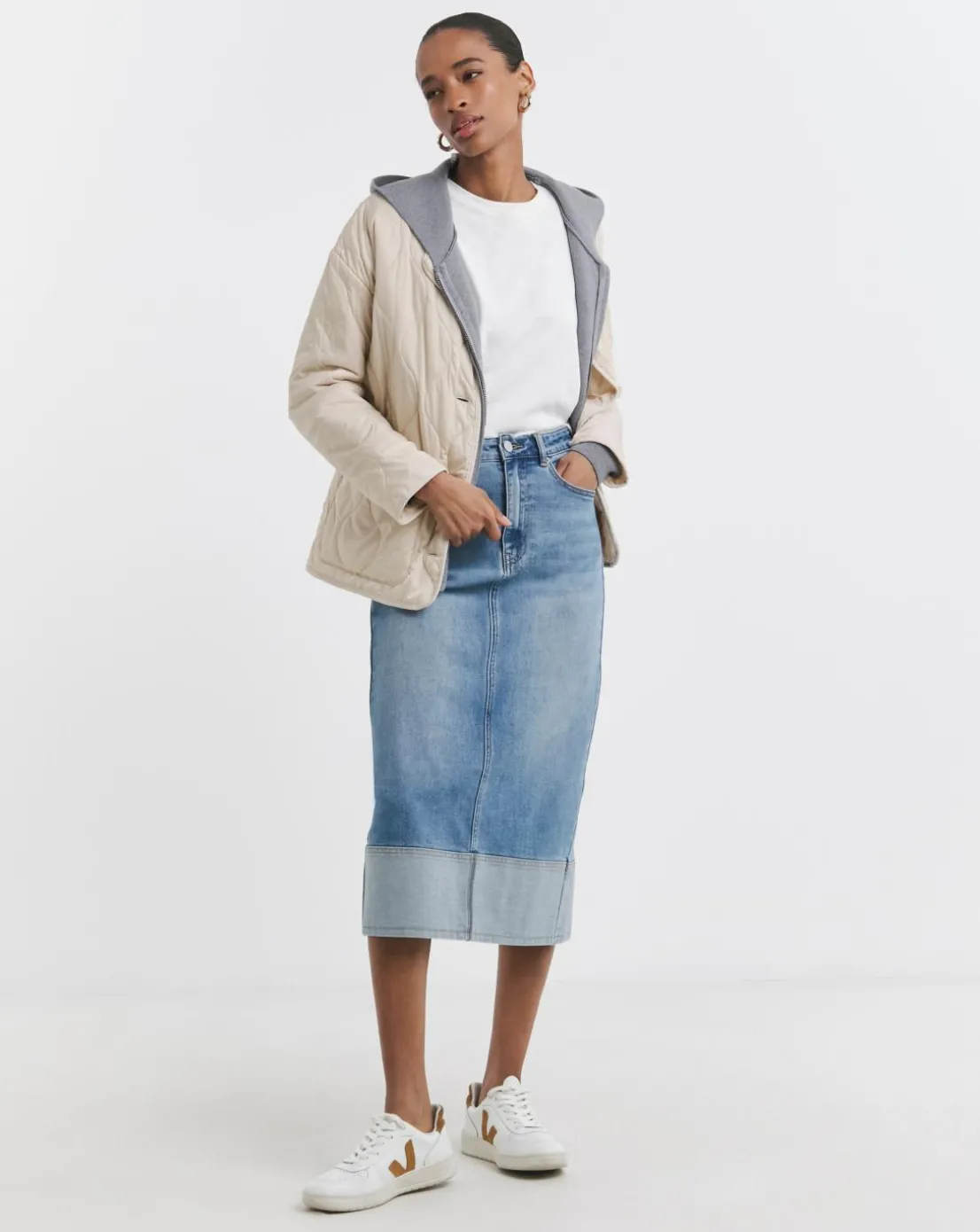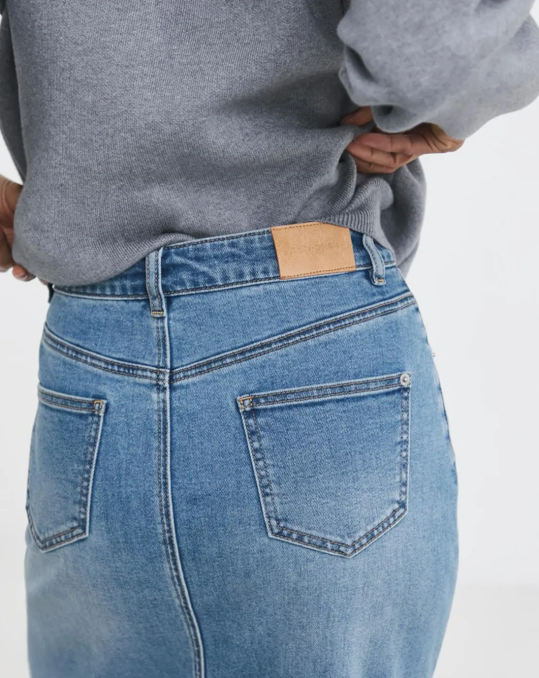 Shop our new colourway on the turn up midi skirt, designed in our comfort stretch denim. Featuring turn up hem detailing, classic jean pocketing and belt loops. Pair with knee boots for an effortlessly chic outfit.