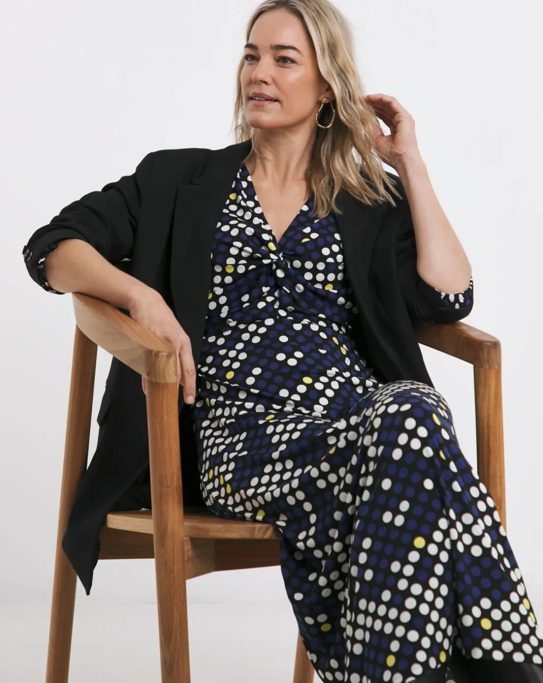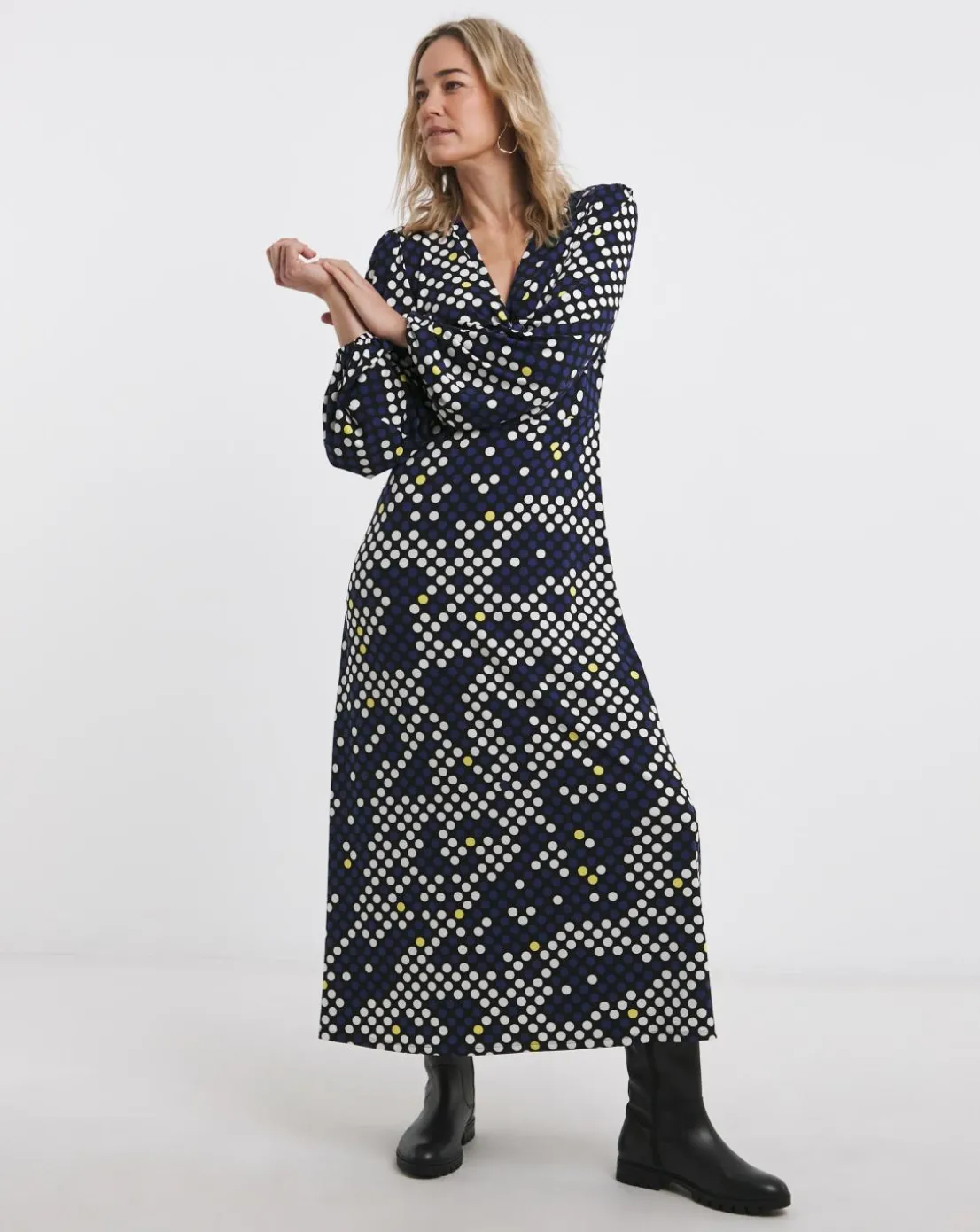 This long sleeve navy spot dress features a front twist detail, v neckline and a midi length 48 inches.