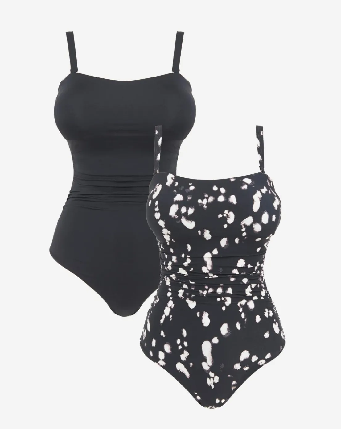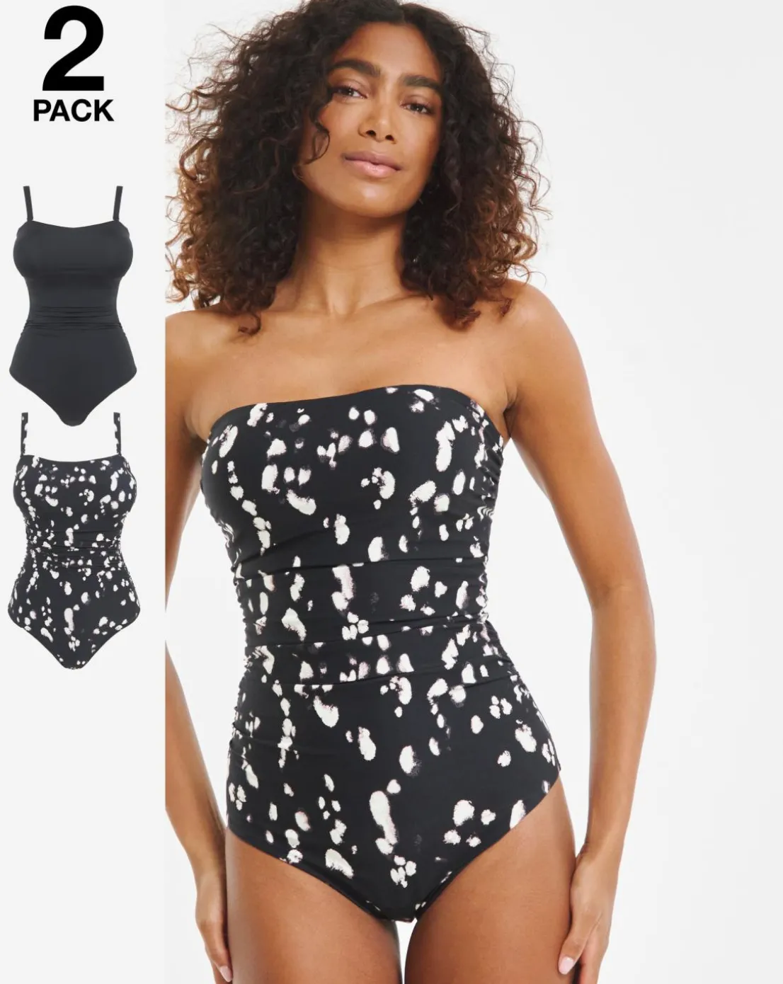 A classic staple in everyone’s holiday wardrobe. These bandeau swimsuits sculpts your curves with powermesh lining. Featuring ruched front detailing, detachable and adjustable straps in a simple black and spot pattern, giving you multiple options on your next trip.