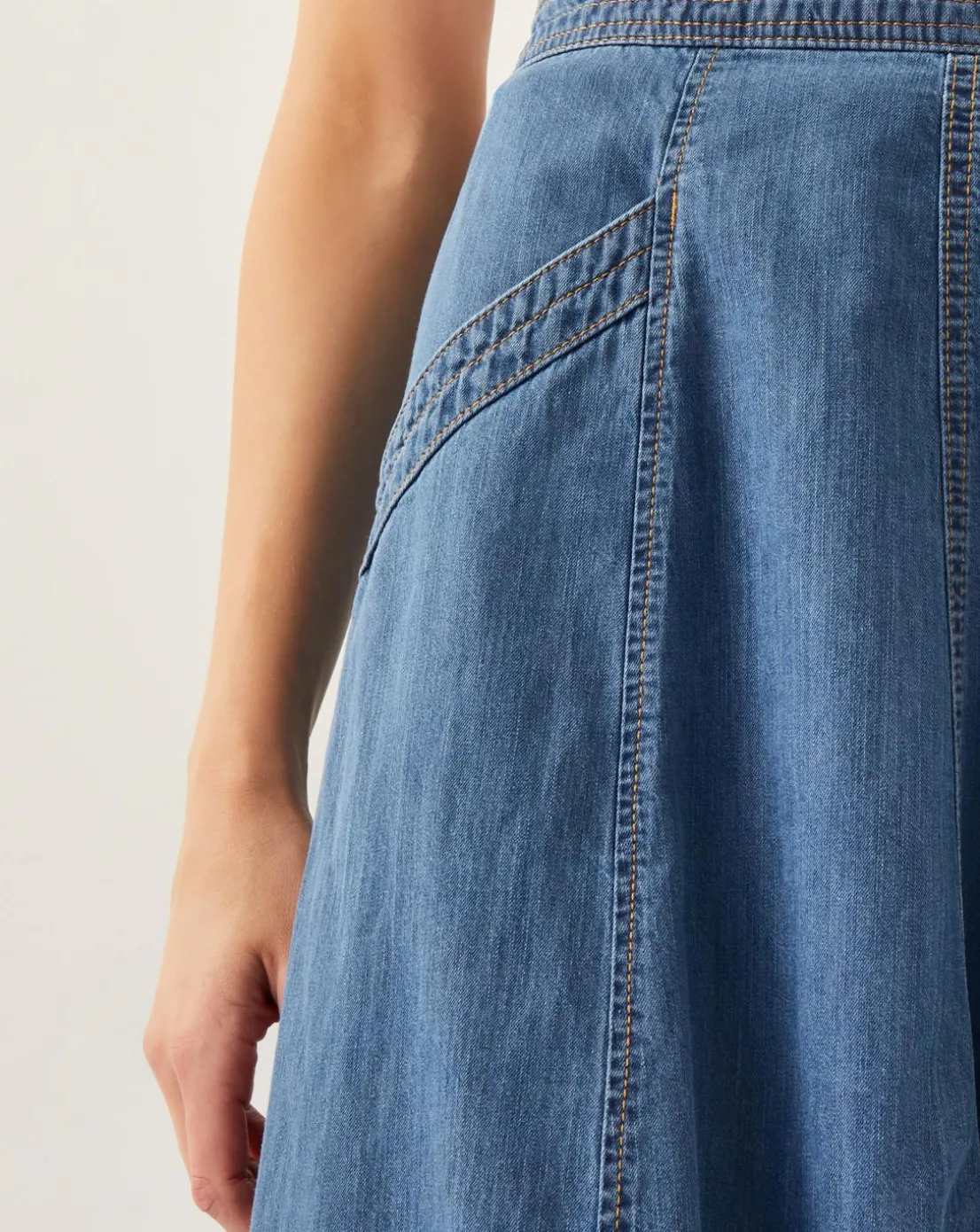 - Seasonal? Couldn’t be this skirt. Falling to midi length, this skirt flares into an A-line cut with tobacco stitching. Style it through summer with a cami and sandals, and winter with knee high boots and a jumper. Finished with pockets (!).