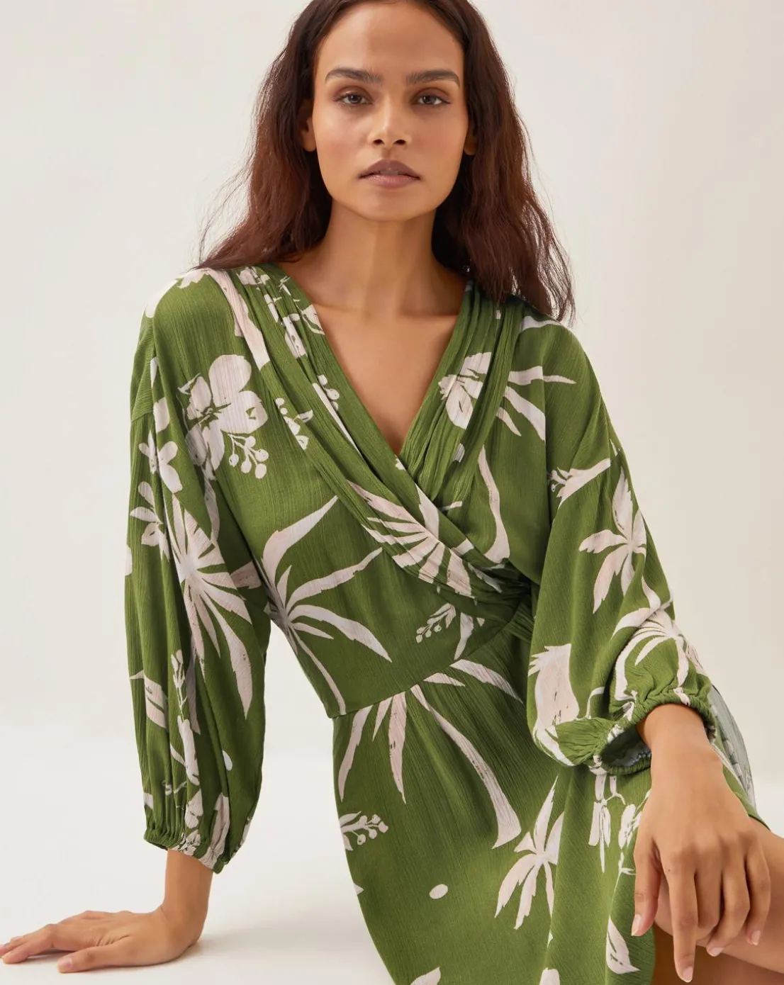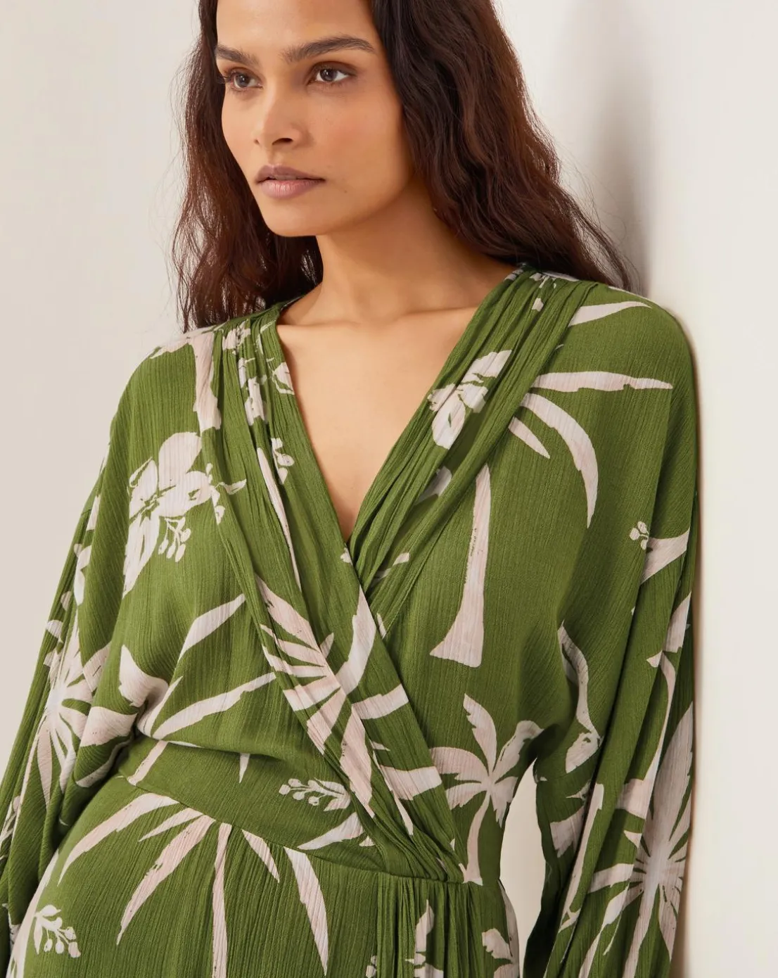 - Wrap up in paradise. Splashed in a khaki hue, this wrap dress hugs you just enough to show off your figure and keep an easy, breezy vibe with the relaxed fit. Cut just-above-the-knee, it’s printed with florals, palm trees, and parrots.