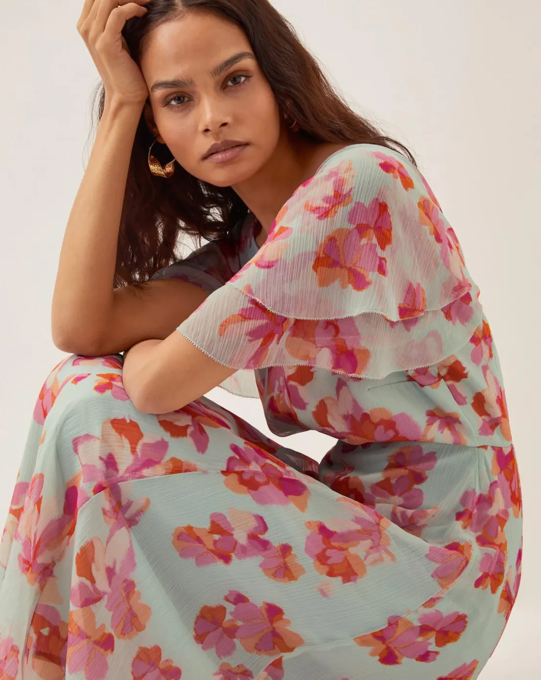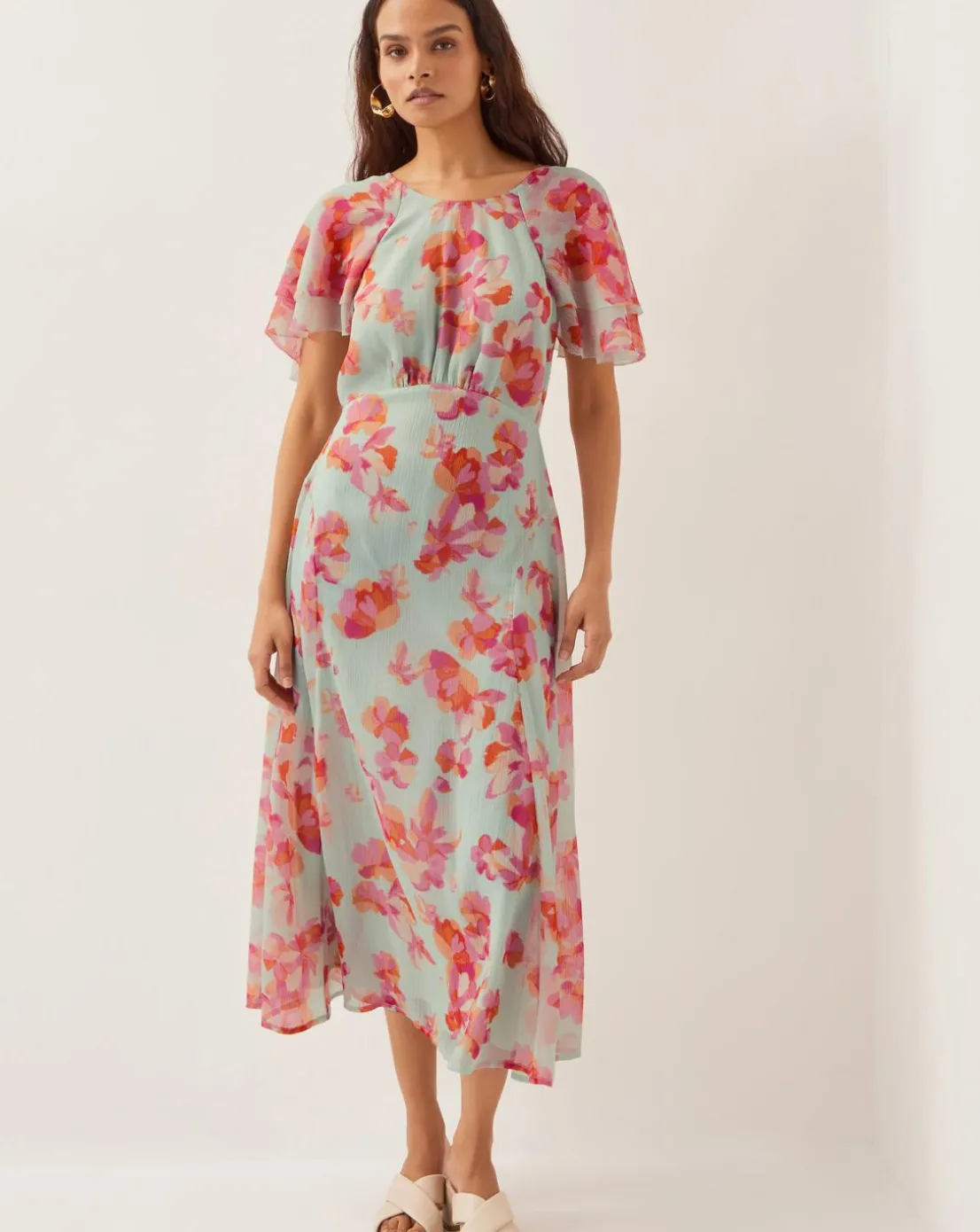 - Prosecco, no-secco, this dress.Blossoming with sunset tones on painterly florals, this dress is ready to strut into wedding season. Built with gauzy angel sleeves, a midi-length skirt and cinched waist, pair it with faithful strappy heels for a special occasion finish.