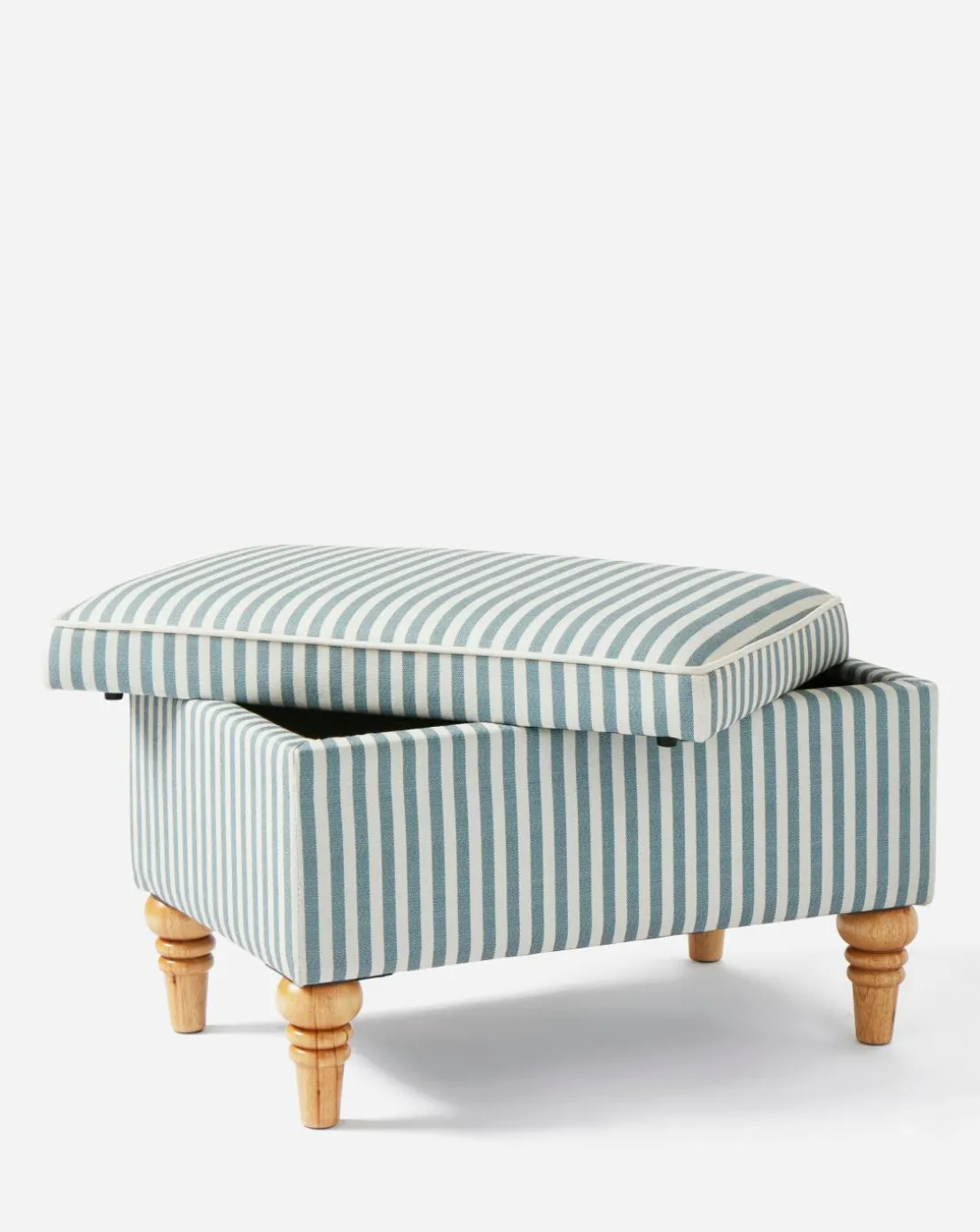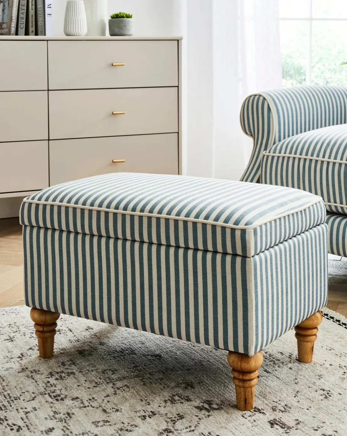 The Naomi Storage Footstool is upholstered in a stripe fabric. The top of the footstool can be removed to reveal storage space. Self assembly required.