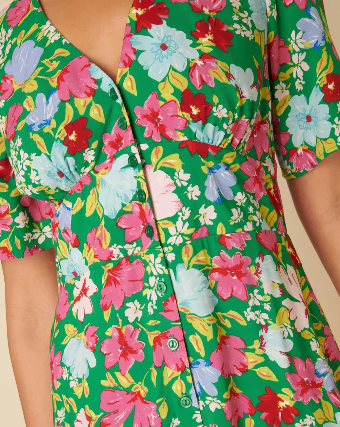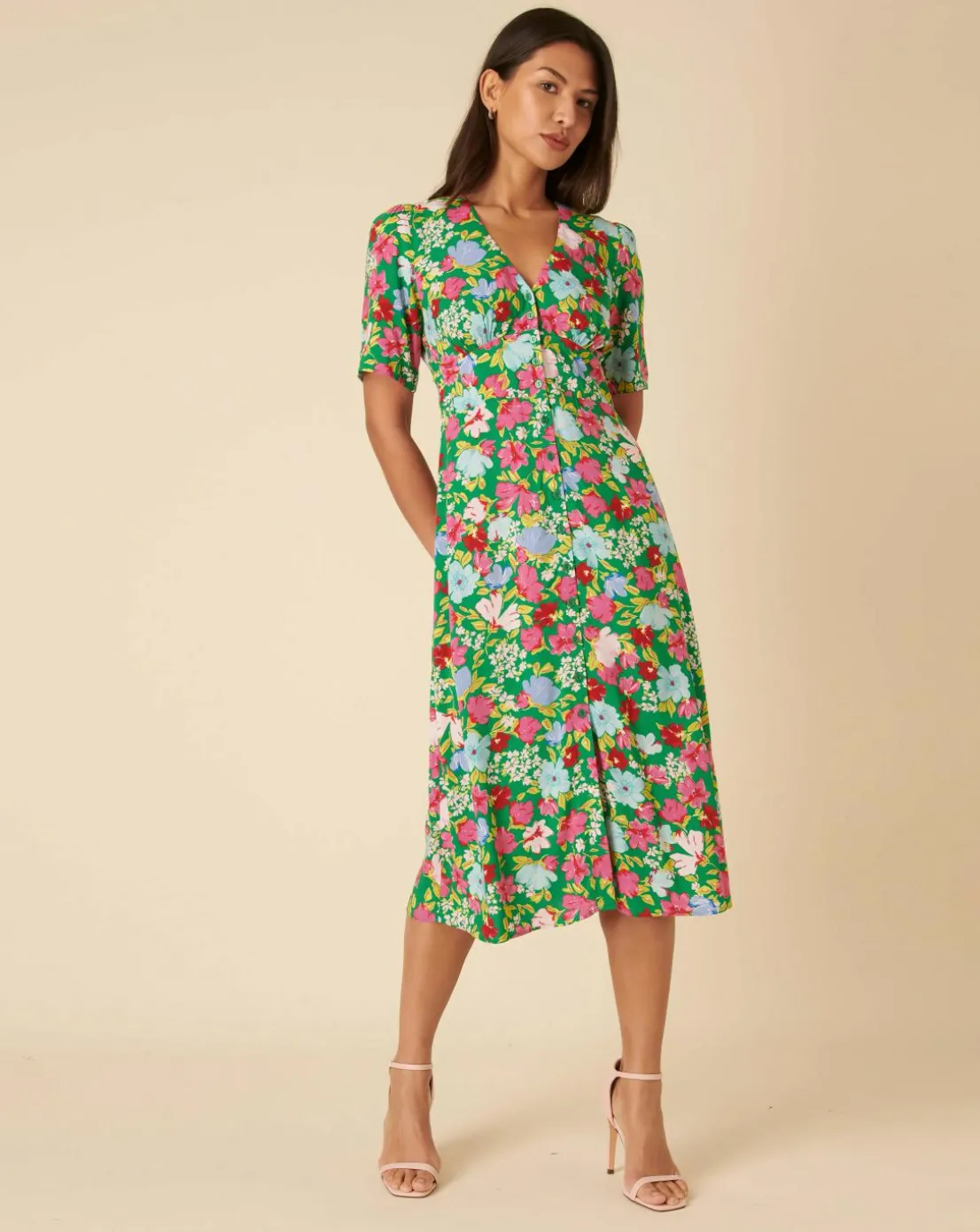 Our iconic style Alexa. Coming in a statement floral print, she is all about vintage-inspired details, from the timeless tea dress cut to the artful button front. We have also added a subtle shirred back to gently pull you in at the waist. Style yours with barely-there heels.