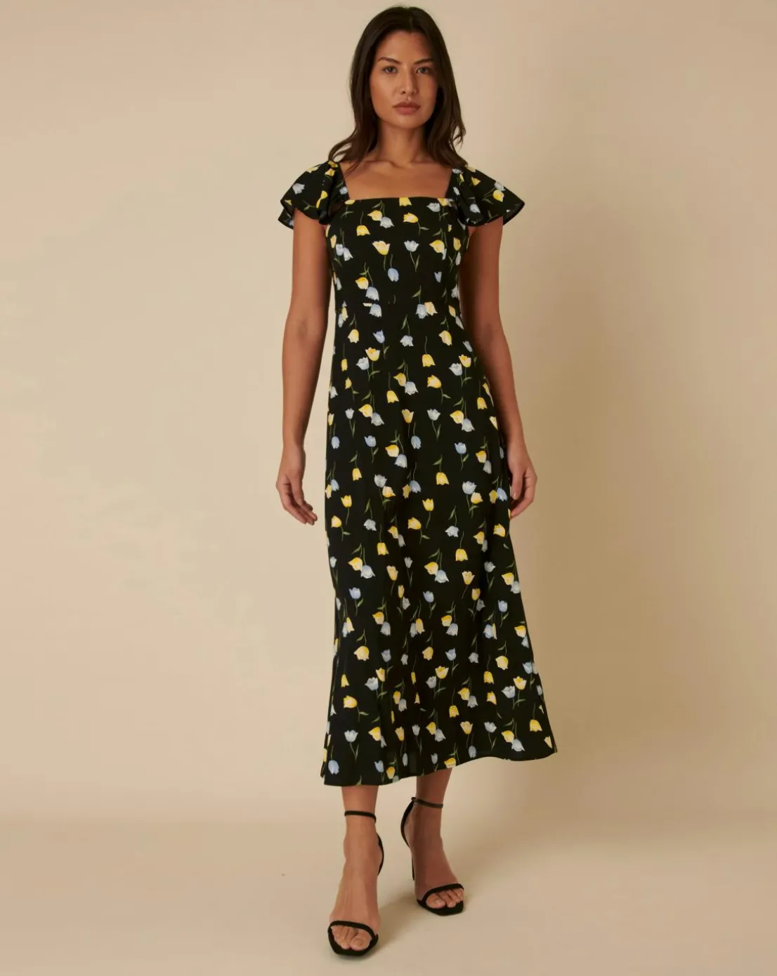 Going somewhere? With delicate flutter sleeves, Elsies a square neck midaxi dress thats sure to get you noticed. This black floral design is ready for every event this summer. Shirring and tie back detail to the back just adds to the fit. Just add gold jewellery.