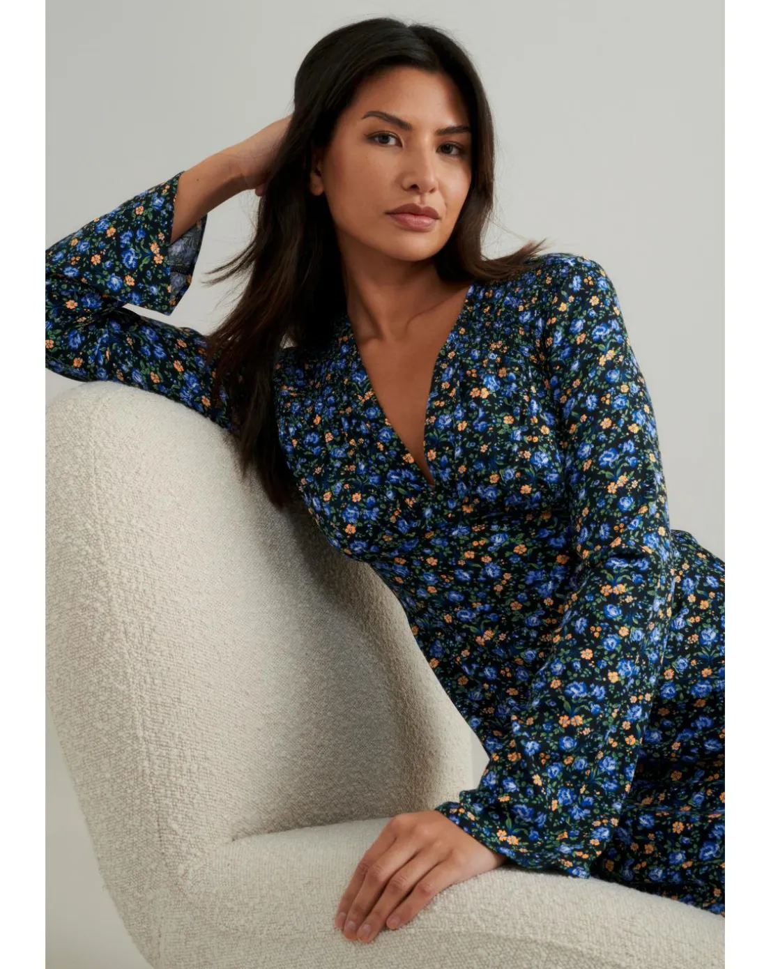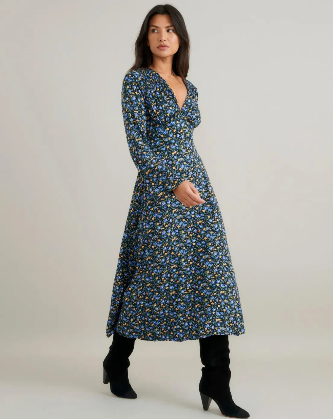 Dress her up or dial her down. Our Lydia blue and yellow floral print dress will take you from day to night in an instant. We love her slightly flared long sleeves and swishy skirt. Style yours with boots or barely-there heels.
