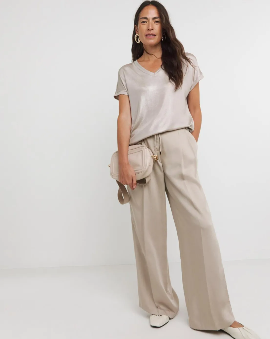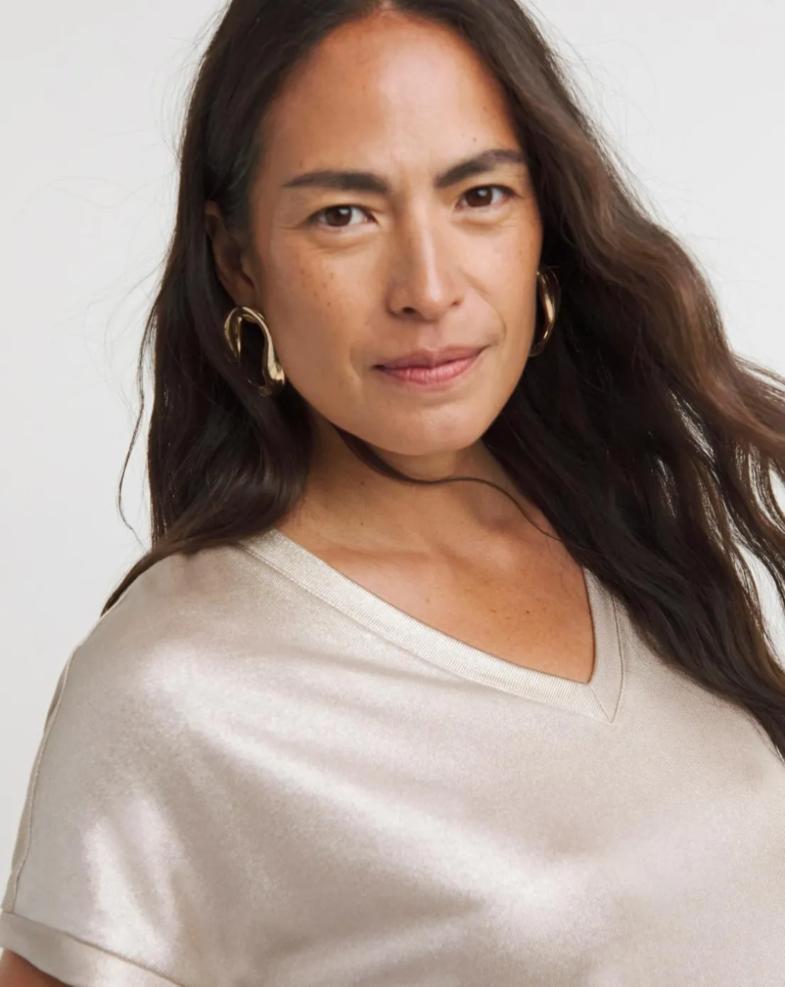 Our v-neck foil t-shirt is an essential for your wardrobe. Pair with jeans and flats for an elevated everyday look.