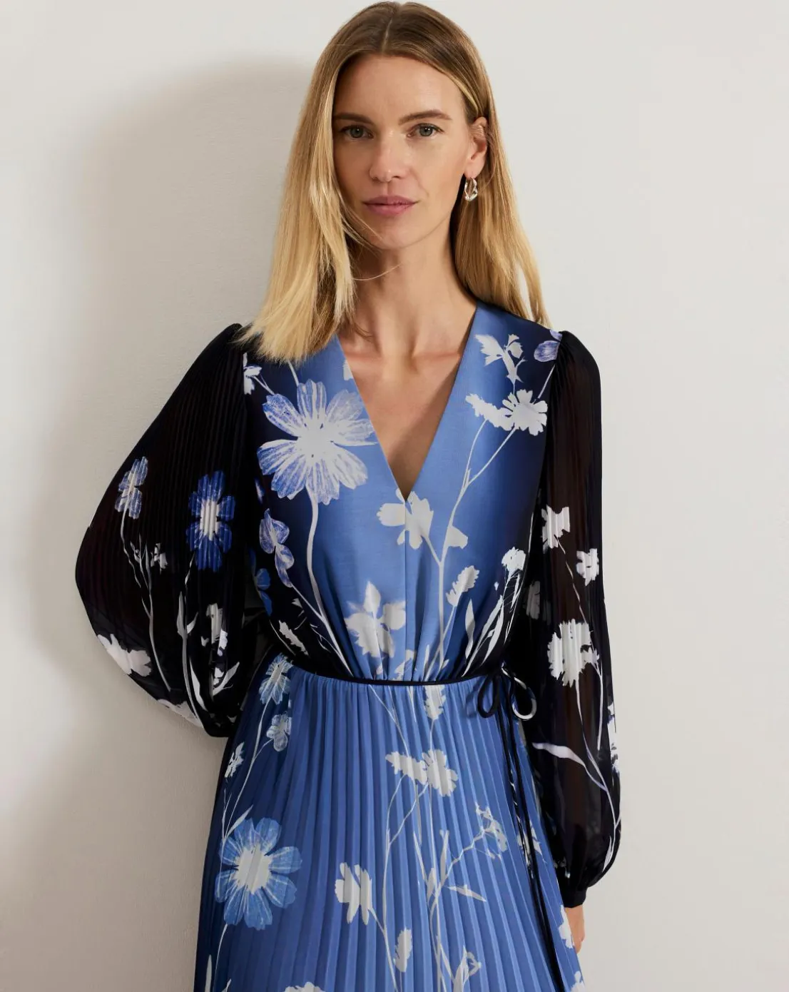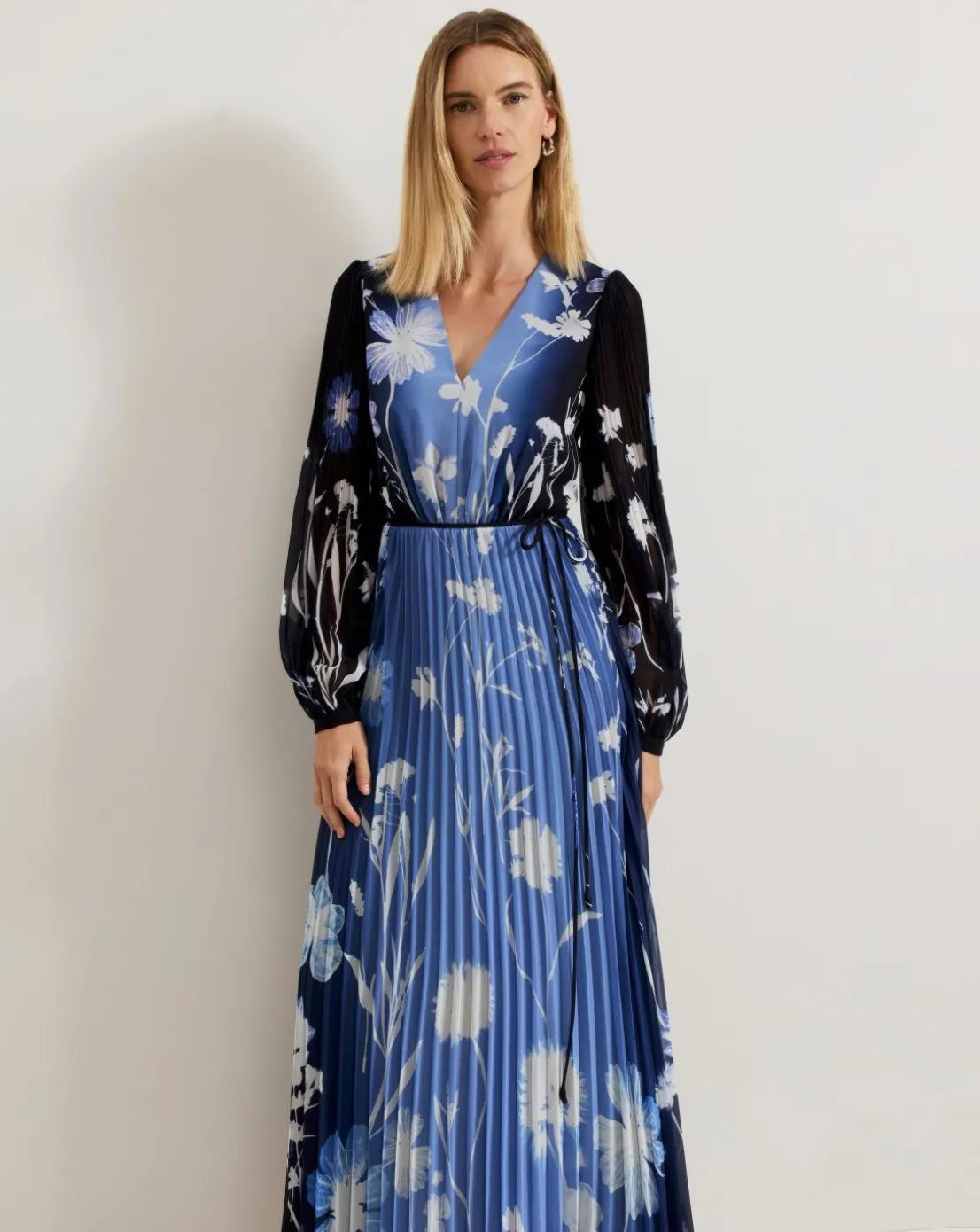 Make a statement in our Annie dress. In a stunning blue ombre shade our maxi dress is decorated with a feminine floral print for added interest. Elegant blouson sleeves add volume to the silhouette, flowing down to a fully pleated maxi skirt that moves with you. This dress is guaranteed to turn heads at every occasion.