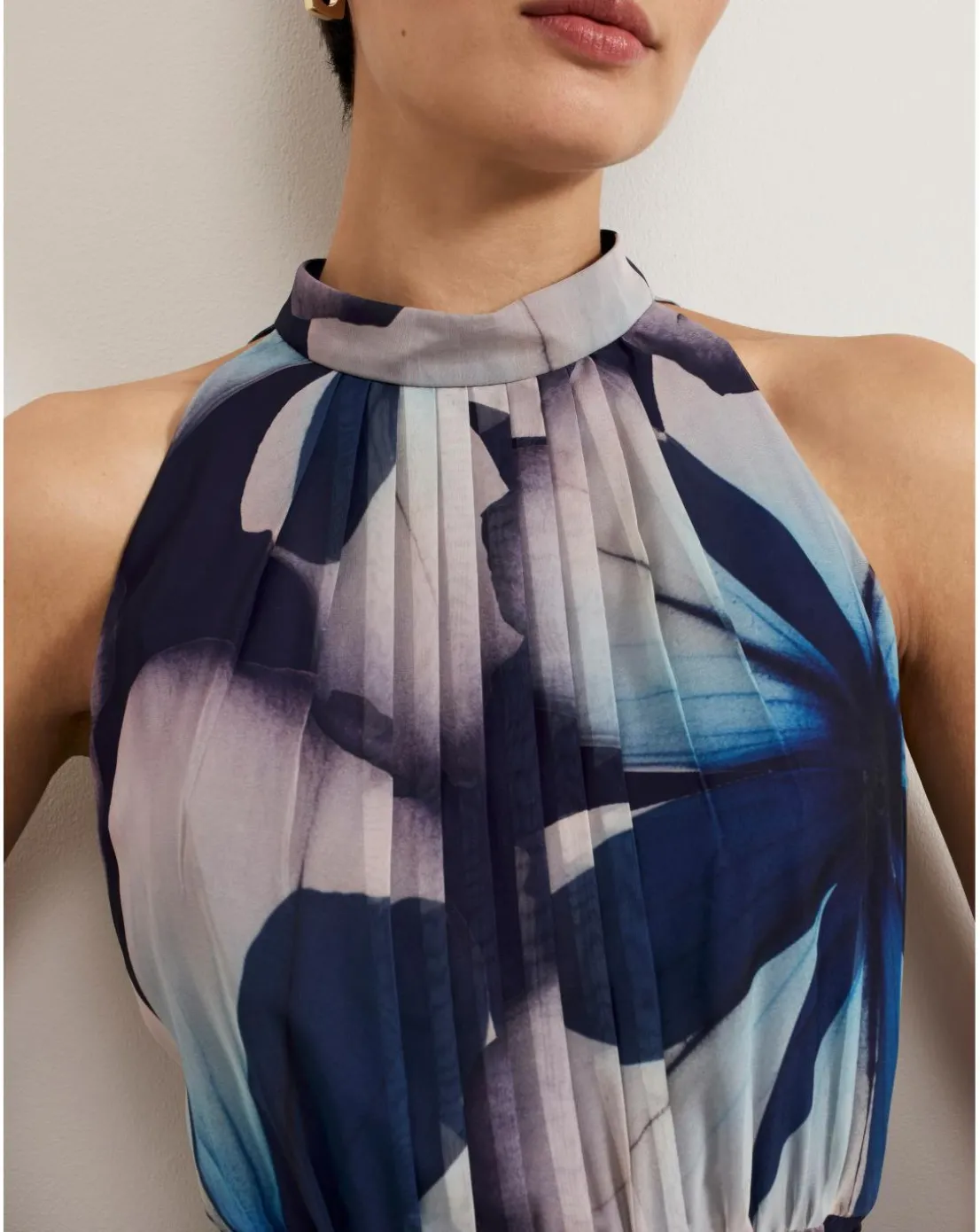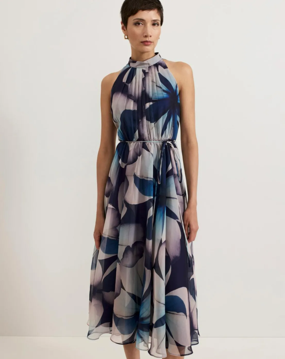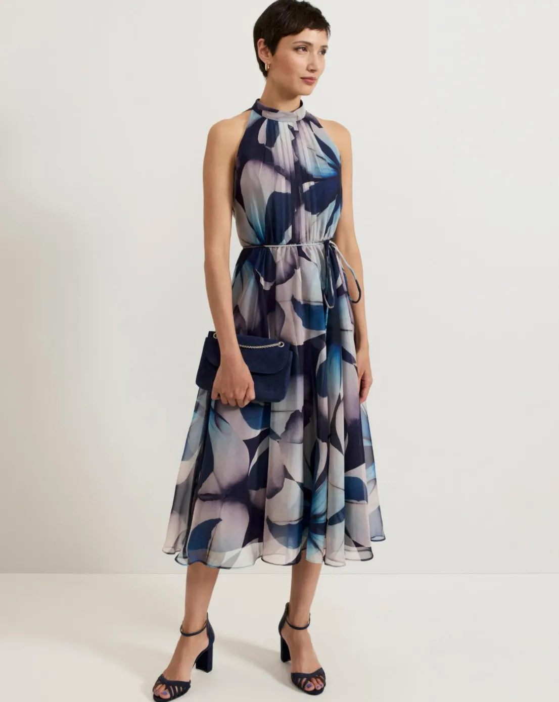 Step up your occasionwear with our Bethany dress. Grounded in a navy and blush pink floral design, the high neckline creates an elegant silhouette. The feminine pleated panel on the bodice sculpts the shape, falling to a flattering midi length. Style with matching navy accessories for a polished event look.
