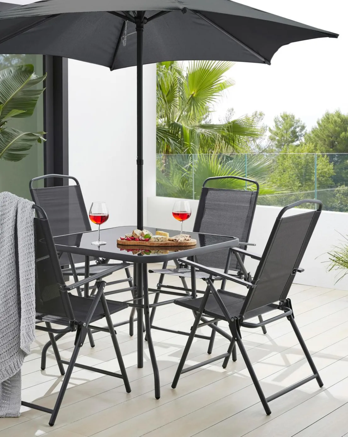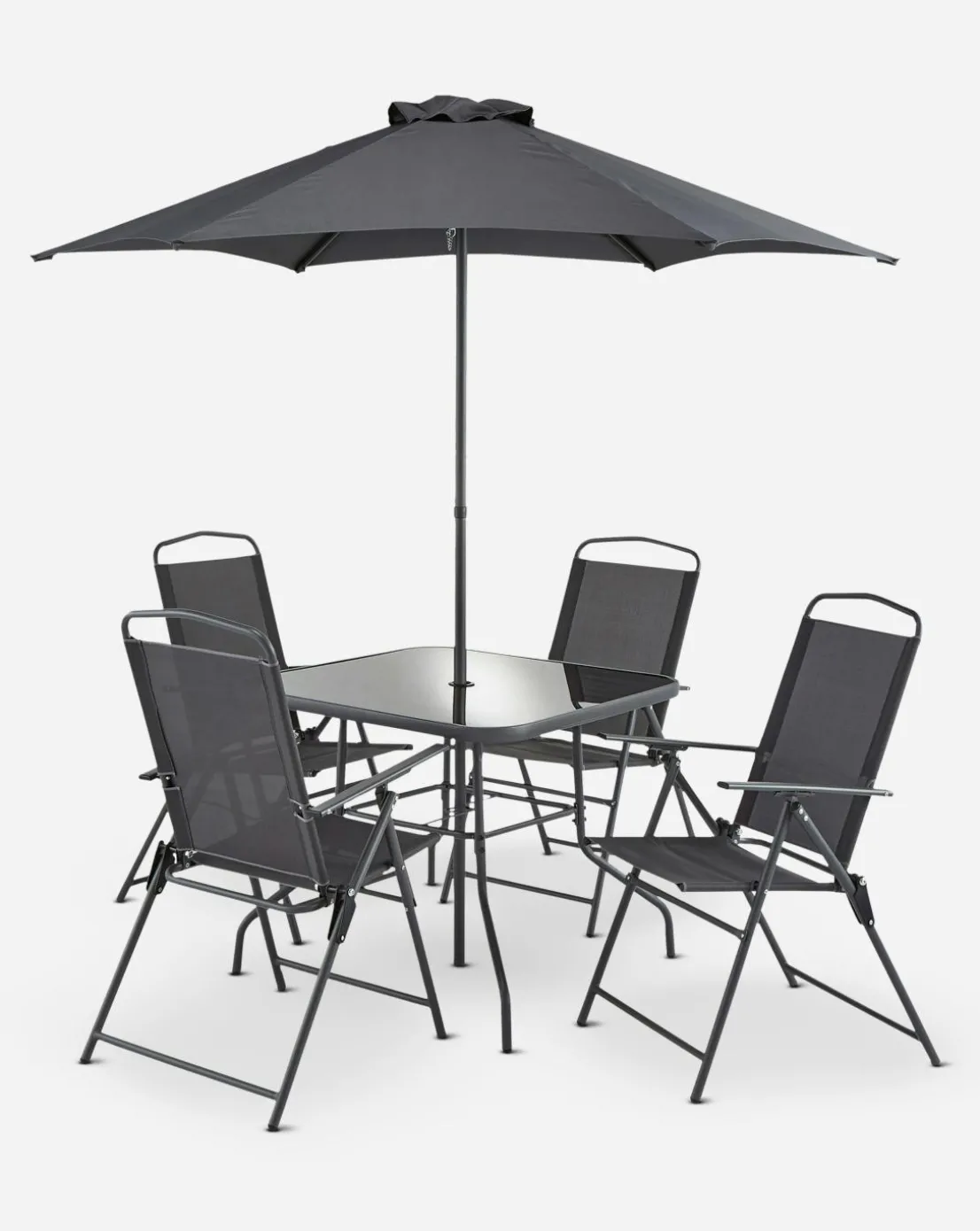Add a touch of contemporary style to your garden or patio with this Porto Dining Set. The chairs can be folded to save space when not in use. Durable and weather resistant for use all year round. Complete with 4 chairs, 1 glass top table and a parasol. Shop the rest of the Porto range.