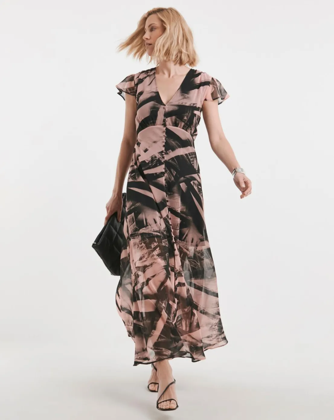 The Indium maxi dress is a stunning blend of elegance and sophistication in our abstract Parallel print in pink and black tones. This flattering bias-cut dress features a V neckline and short sleeves, offering a timeless and graceful silhouette. The maxi length and centre front slit add a touch of allure, while the faux button detailing enhances its classic charm. Perfect for any special occasion, the Indium maxi dress exudes effortless style and refinement, ensuring you look and feel your best wherever you go. The fabric is made out of 55% recycled polyester, making it an eco-friendly choice.