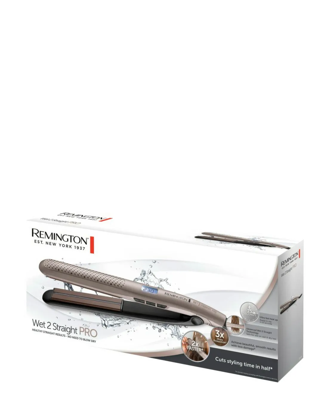 Want to create your style faster? The Wet 2 Straight Pro Straightener has Advanced Wet 2 Straight Technology that lets you straighten your hair dry. With the Exclusive Venting System quickly removes excess water meaning you can skip the step of blow-drying and cut your styling time in half. The Moisture Sensor lets you straighten your hair at the optimum temperature with 3x More Protection, for healthy-looking, straight results. The Wet 2 Straight Pro Straightener features Advanced Wet 2 Straight Technology. Combining an Exclusive Venting System and a Moisture Sensor, you can create your go-to style quickly, at the optimum temperature. Quickly removing and evaporating excess water with every stroke and releasing it through the outer housing surrounding the plate, this dries your hair whilst you straighten, Cutting Styling Time in Half. Selecting Wet Mode activates the straightener to be used on damp hair, meaning you can shower, towel dry, then straighten. Alternatively, you can choose Dry Mode on those non hair wash days to use as a standard straightener.
