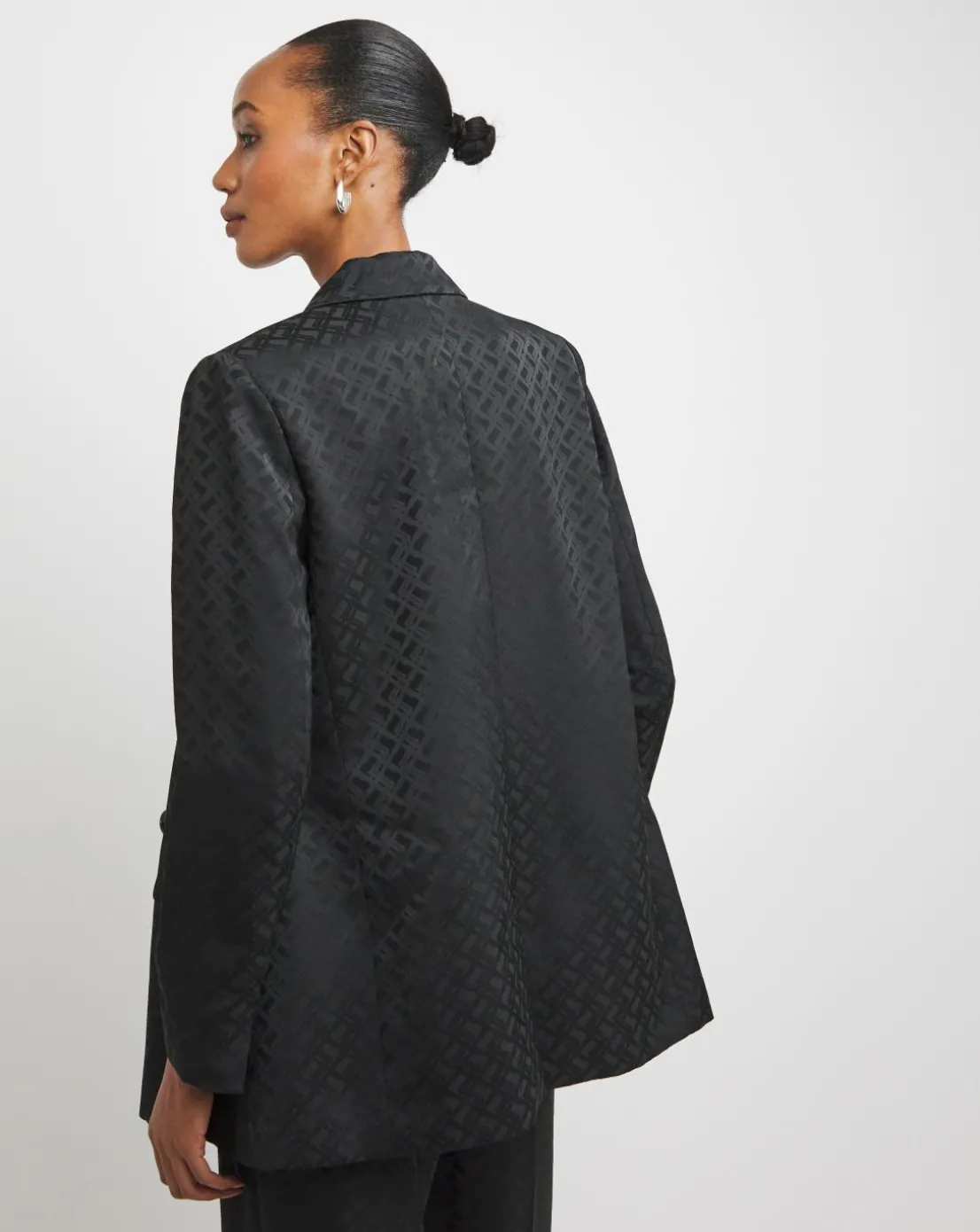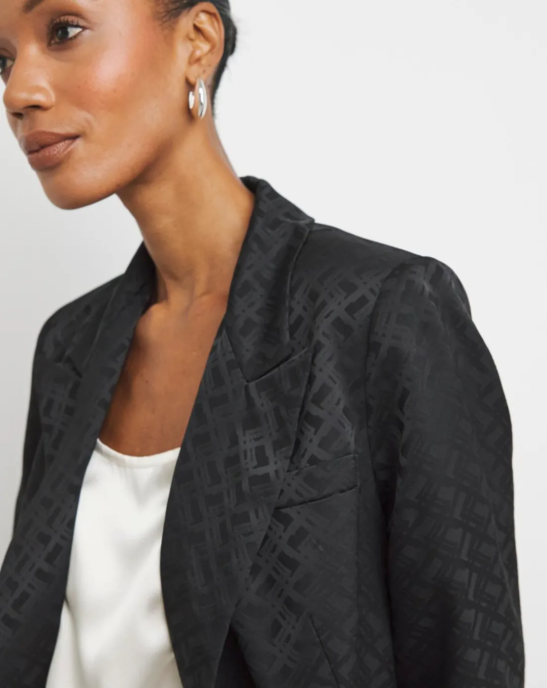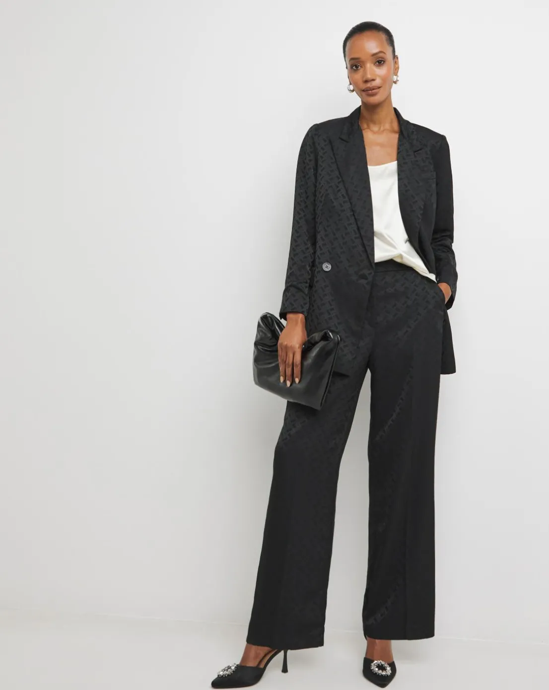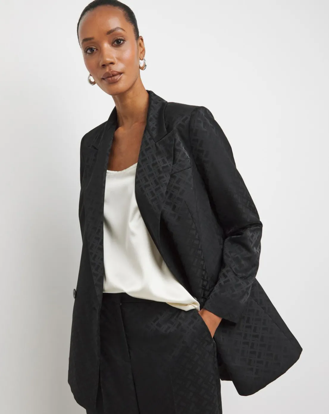 This black double breasted blazer is made with a beautiful satin jacquard fabric, perfect for party season. Pair with the matching trousers for the full suit, or with trousers and a cami for day to night wear.