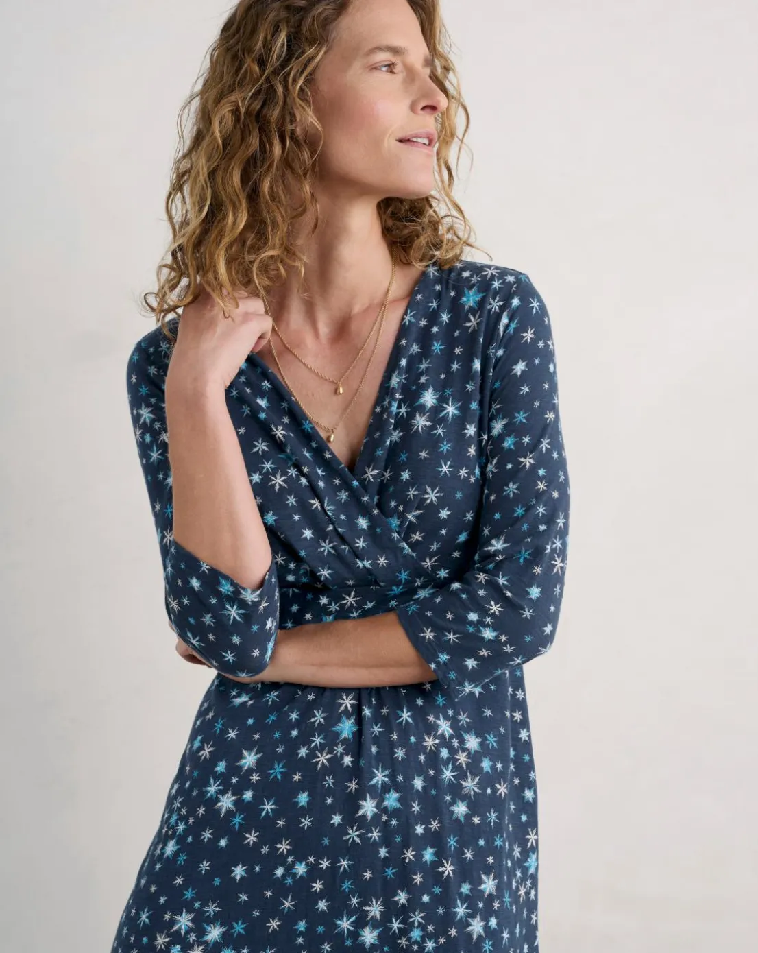 3/4 sleeve, wrap-style neckline jersey midi dress with gentle gathers under the bust that flow into a beautifully drapey skirt. Made from soft organic cotton jersey for comfort and movement. The perfect wear-anywhere dress, pair with boots or trainers for effortless everyday style.