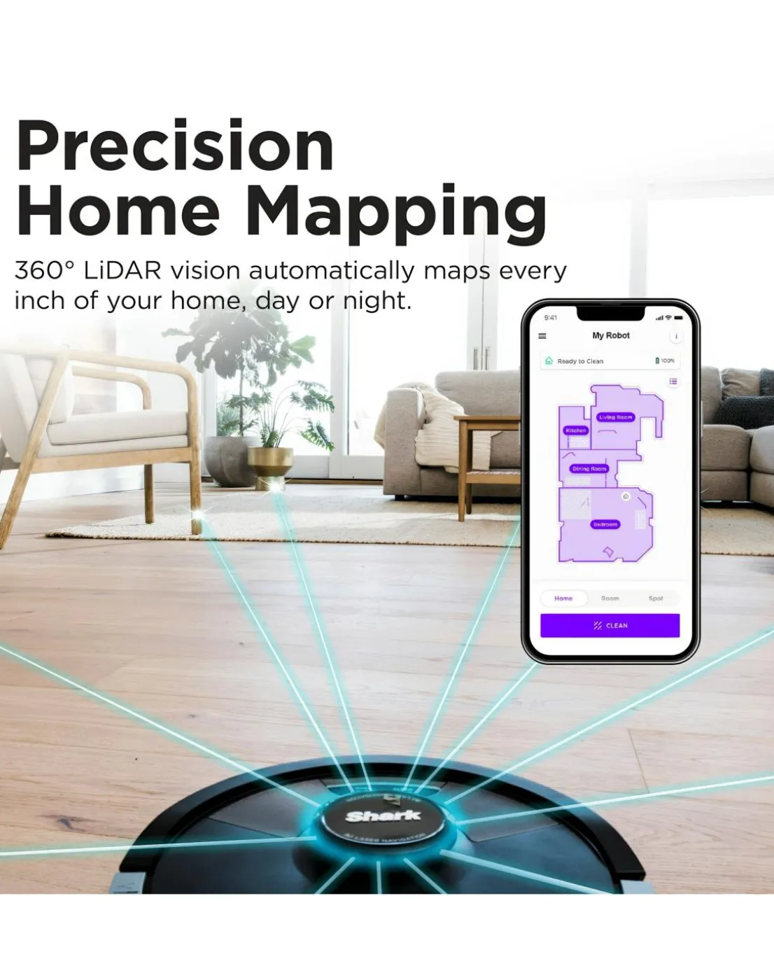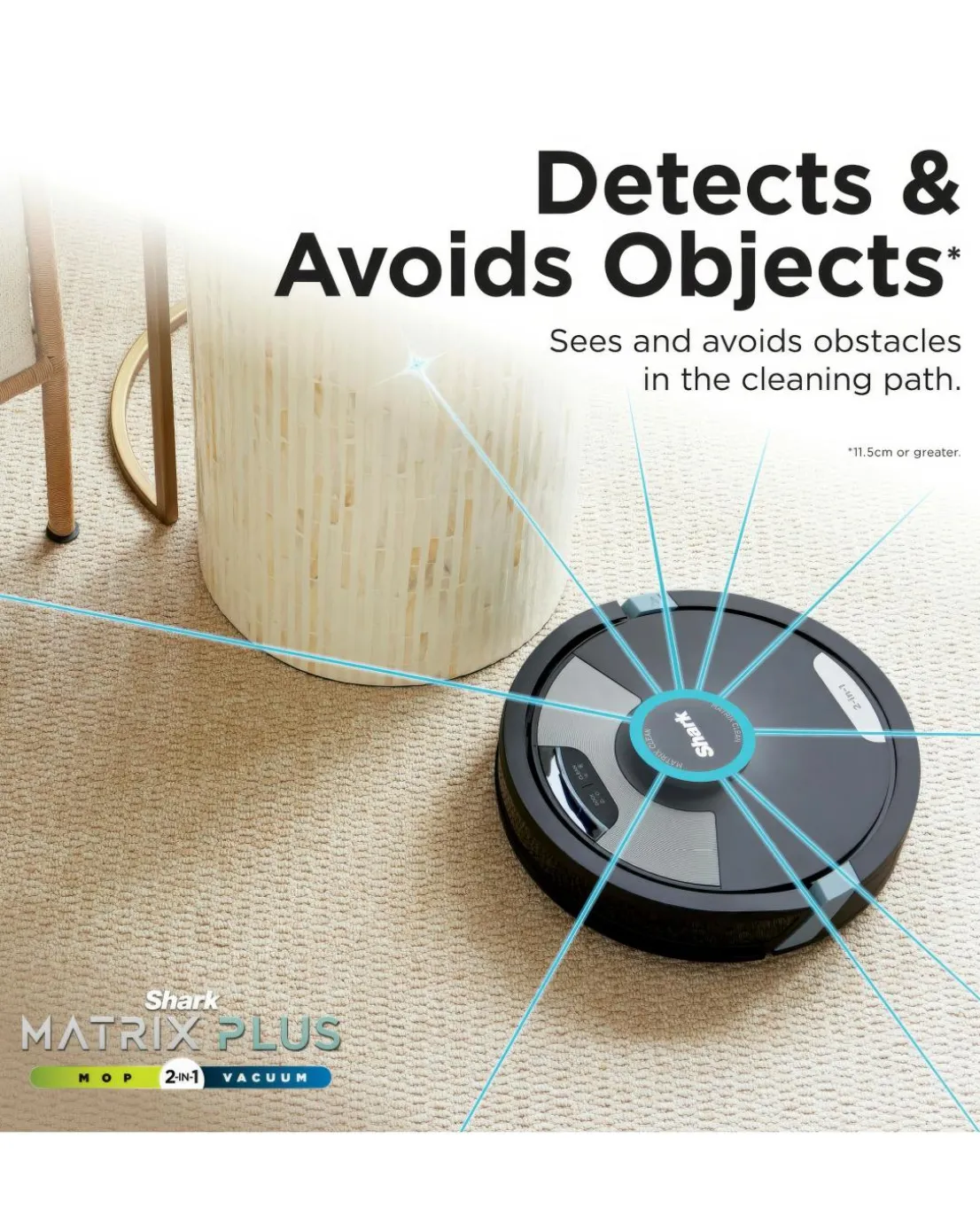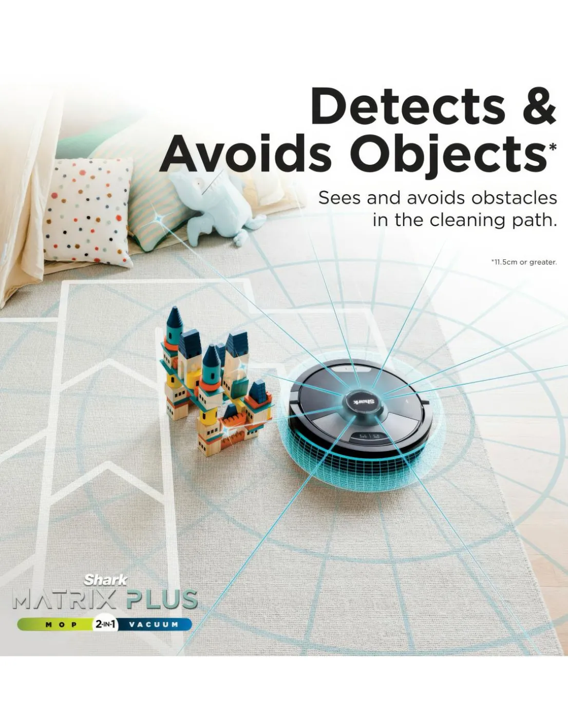 Suction power and Sonic Mopping with precision matrix cleaning for optimum coverage. Self-empties and charges after every clean and can hold up to 60 day*s worth of dirt and debris. Use the SharkClean app to select specific areas to clean on-demand, initiate Matrix Clean, set cleaning schedules, and set custom carpet and no-go zones. The Shark Matrix Plus 2-in-1 Robot Vacuum and Mop combines suction power and sonic mopping for a complete clean from start to finish. Matrix Clean: The robot cleans in a precision matrix grid for optimum coverage, taking multiple passes over dirt and debris. Cleans edges & corners: CleanEdge Detect uses blasts of air and corner recognition to remove debris from edges and corners, pulling debris into the cleaning path for 50* better edge cleaning*. Recharge & Resume: The robot returns to its base, recharges, and can pick up where it left off. Up to 110 minutes run-time** from one charge. Tackle stuck-on stains: Sonic Mopping scrubs hard floors 100x per minute. For extra deep cleaning, initiate Matrix Mop in the app to focus mopping on targeted zones. Safe to use on all sealed hard floors including wood, tile and laminate. Self-cleaning brush-roll: Digs deep into carpets and directly engages hard floors, removing hair from the brush-roll as it cleans with Anti Hair Wrap Technology. Precision home mapping: Quickly and accurately maps your home, so your robot can methodically clean, detecting and avoiding objects*** in its path, day or night. It creates a precise home map in the SharkClean app so you can select specific areas to clean on-demand, initiate Matrix Clean, and set cleaning schedules from anywhere.