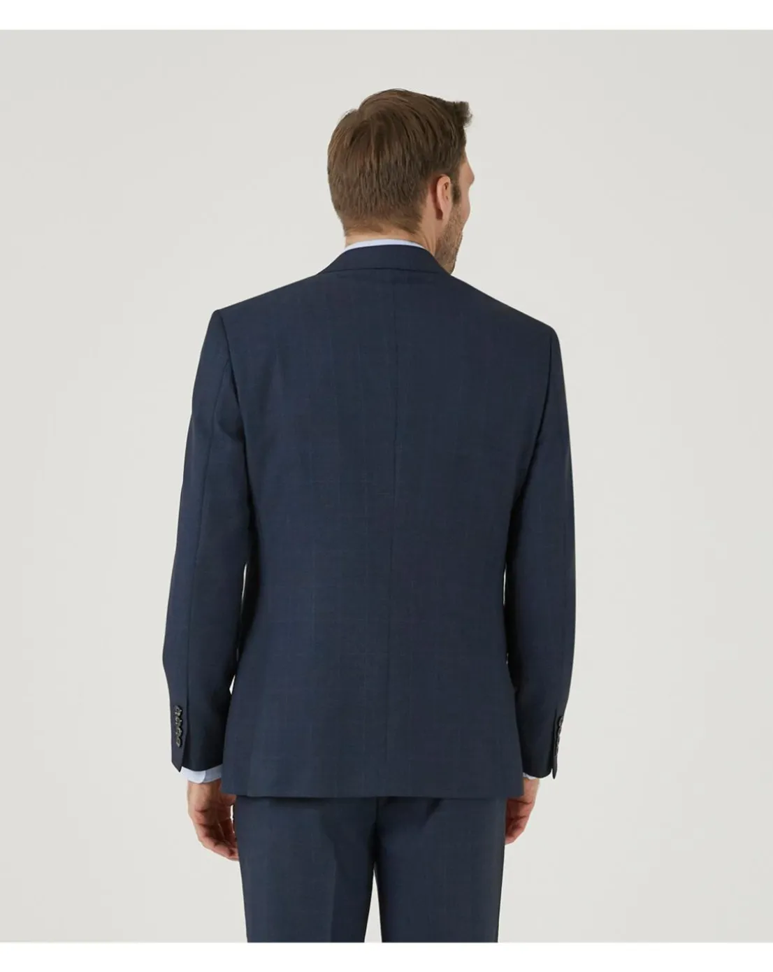 - Single breasted two button tailored fit suit jacket in navy check fabric.