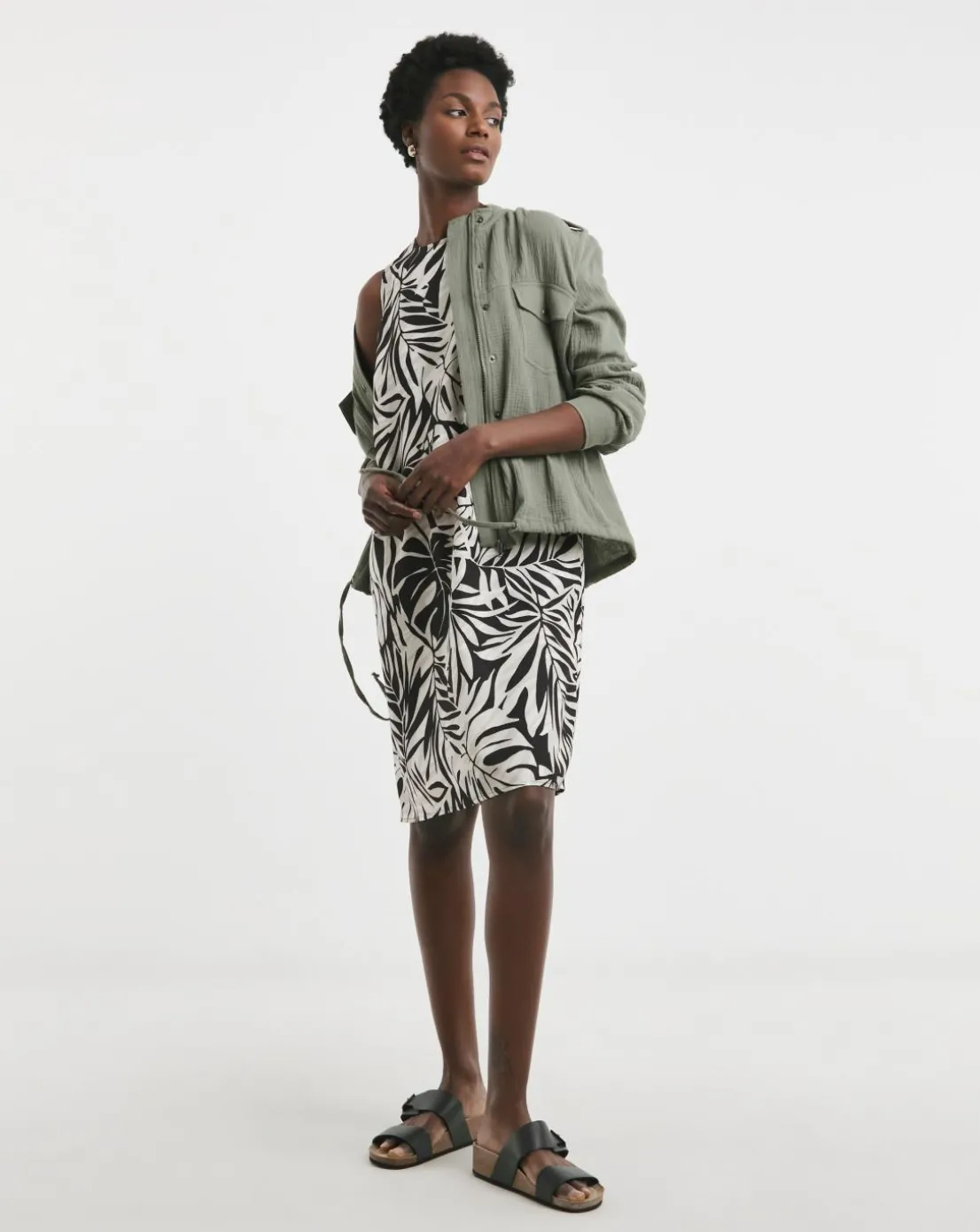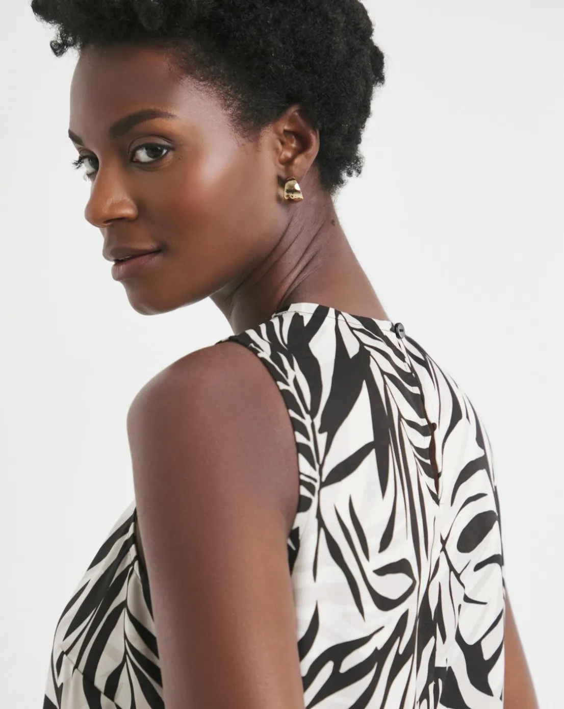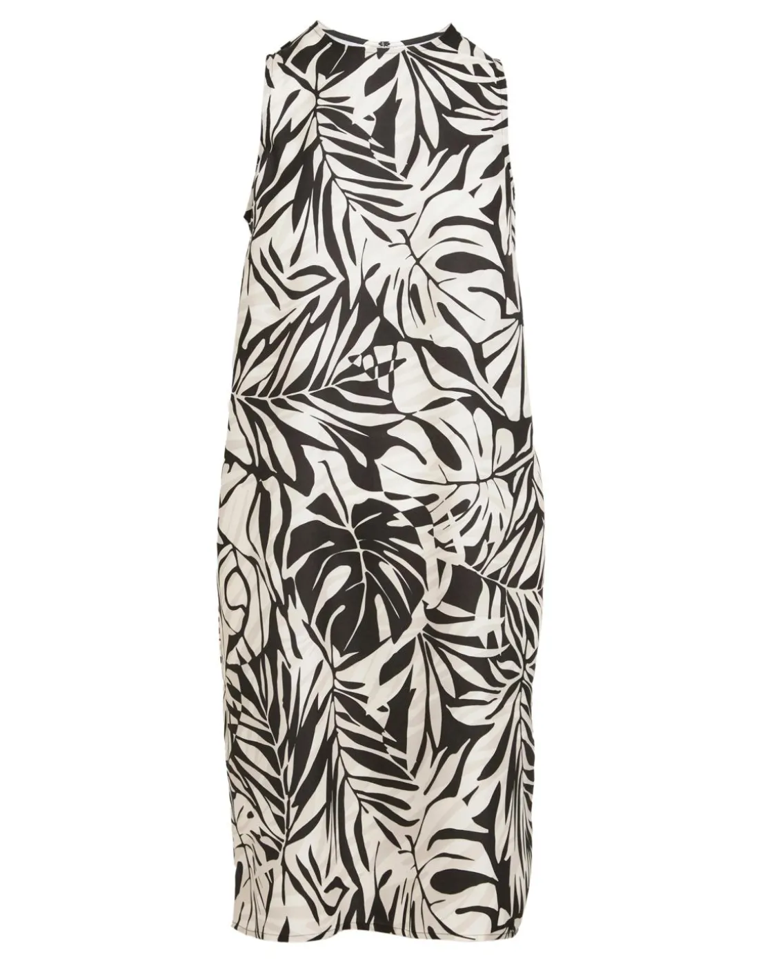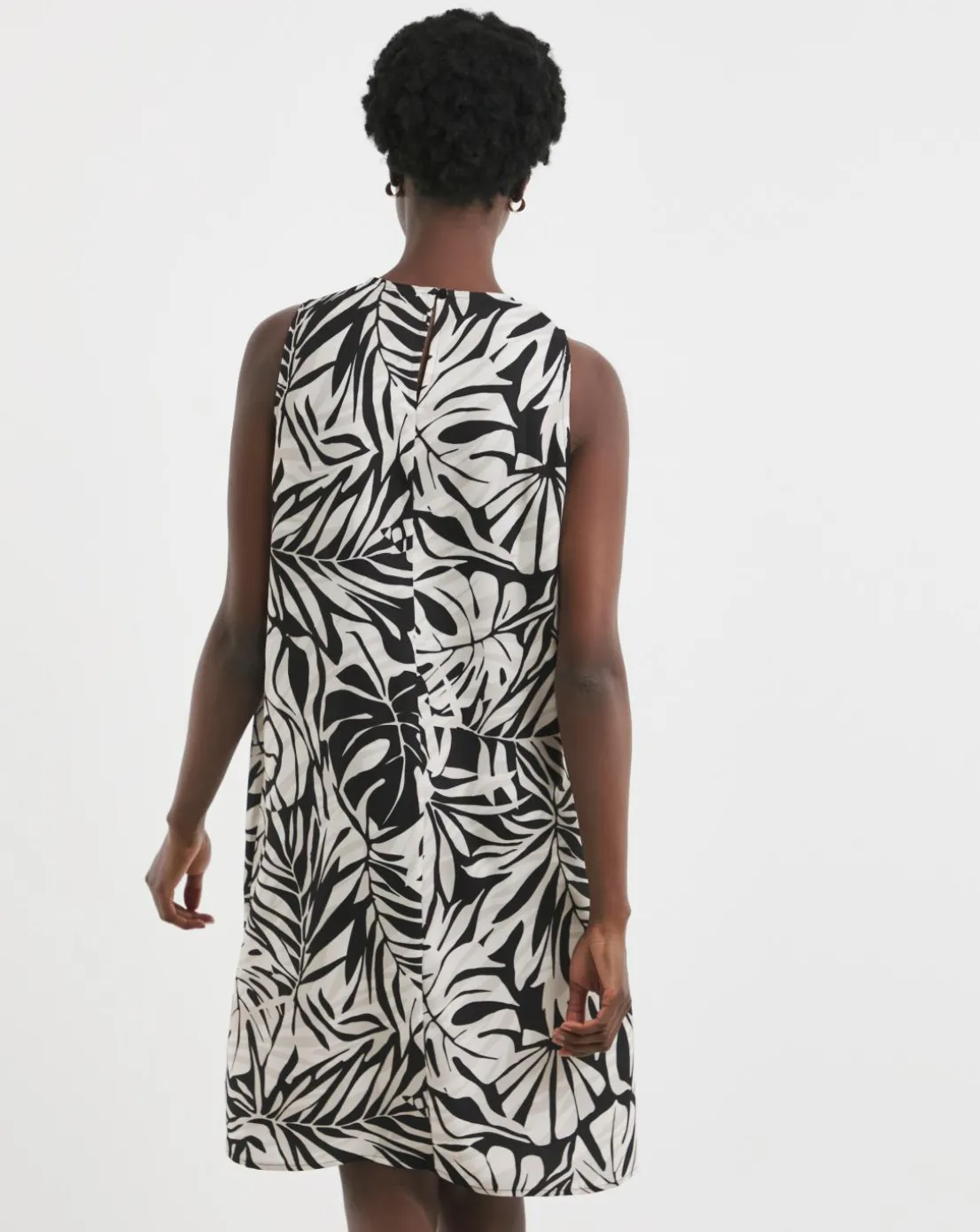 This sleeveless shift is the perfect dress for any occasion, the print comes in a gorgeous black leaf design. The dress is knee length 39 inches.