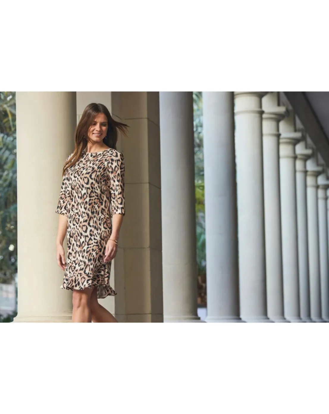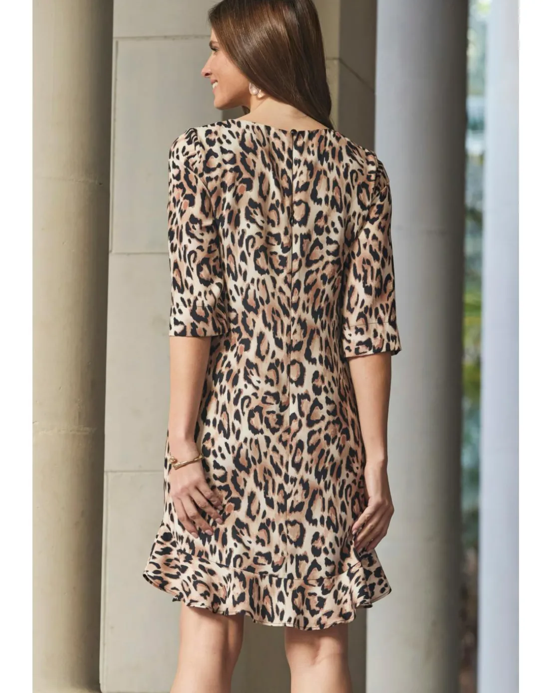 Chic in 60 seconds, that body-skimming shift silhouette is so comfy, falls to a swishy double ruffle hem, finishedwith gorgeous frilled sleeves, wear-forever leopard print, pairs perfectly with courts strappies or platforms.
