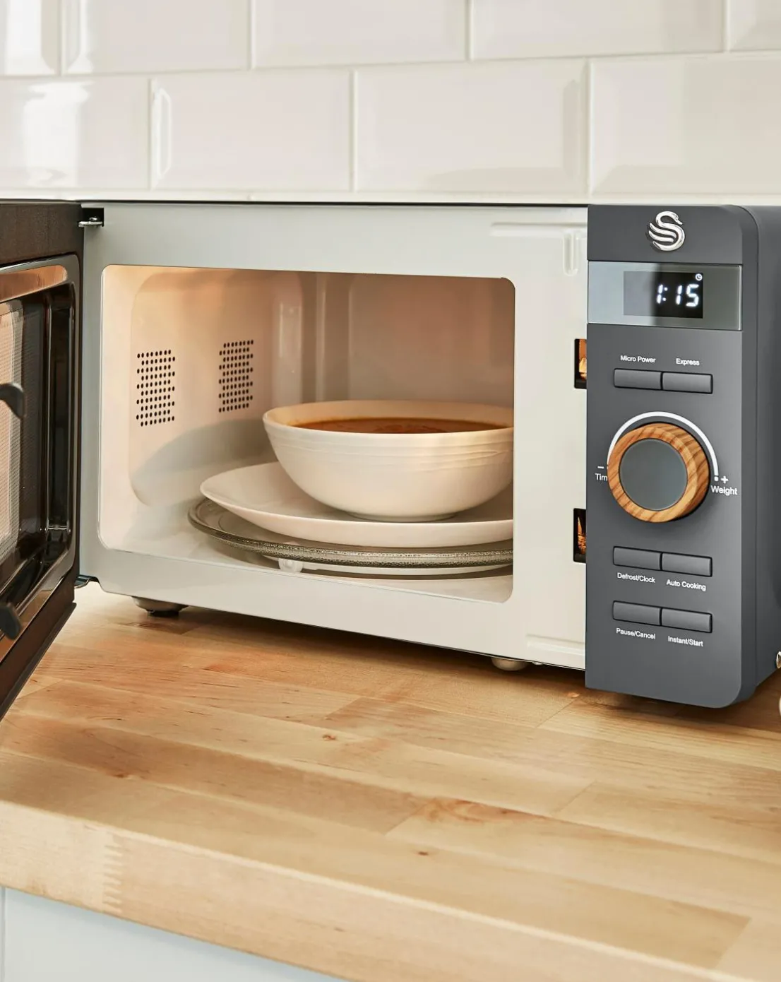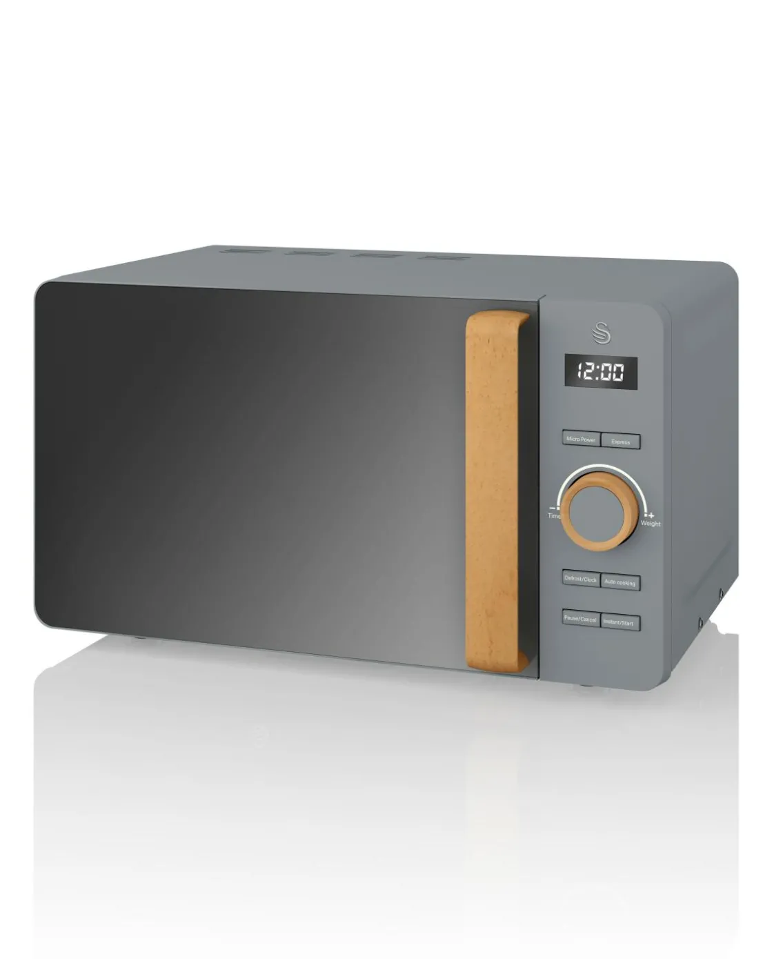 For a sleek Scandinavian look, look no further than the Swan 20Litre 800W Digital Nordic Style Grey Microwave. Features rubberised wood effect handle door, rubberised housing / door / control panel, 30 minute timer, 6 power levels including defrost setting, 27cm glass turntable and cooking end signal. Solo.