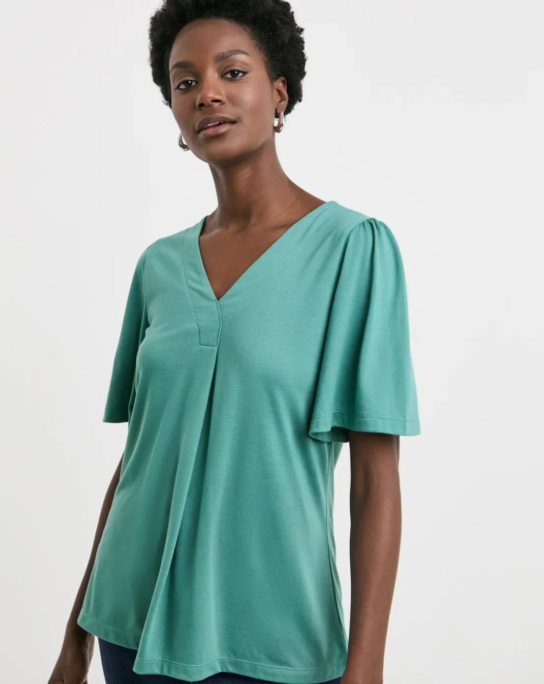 Our v-neck angel sleeve top is a beautiful addition to your wardrobe. Pair with jeans and flats for a stylish everyday look.