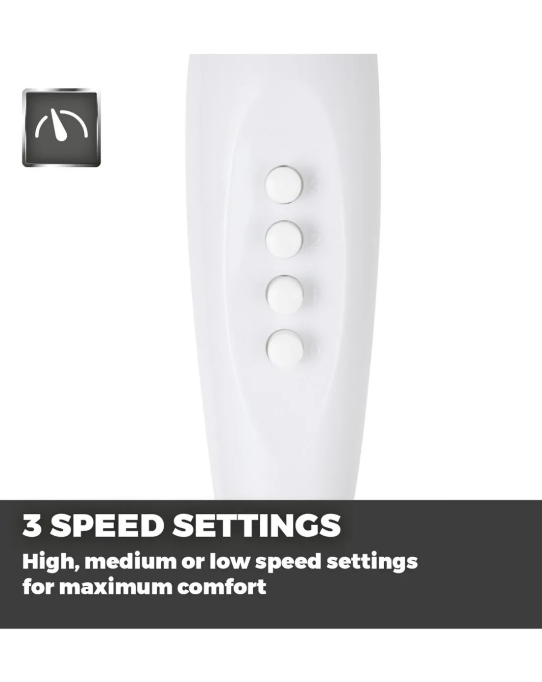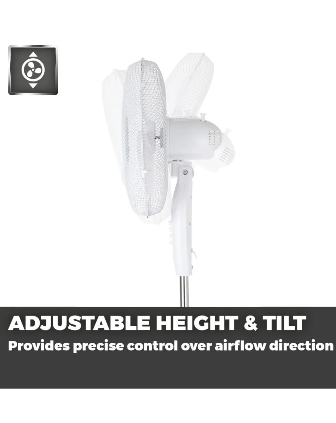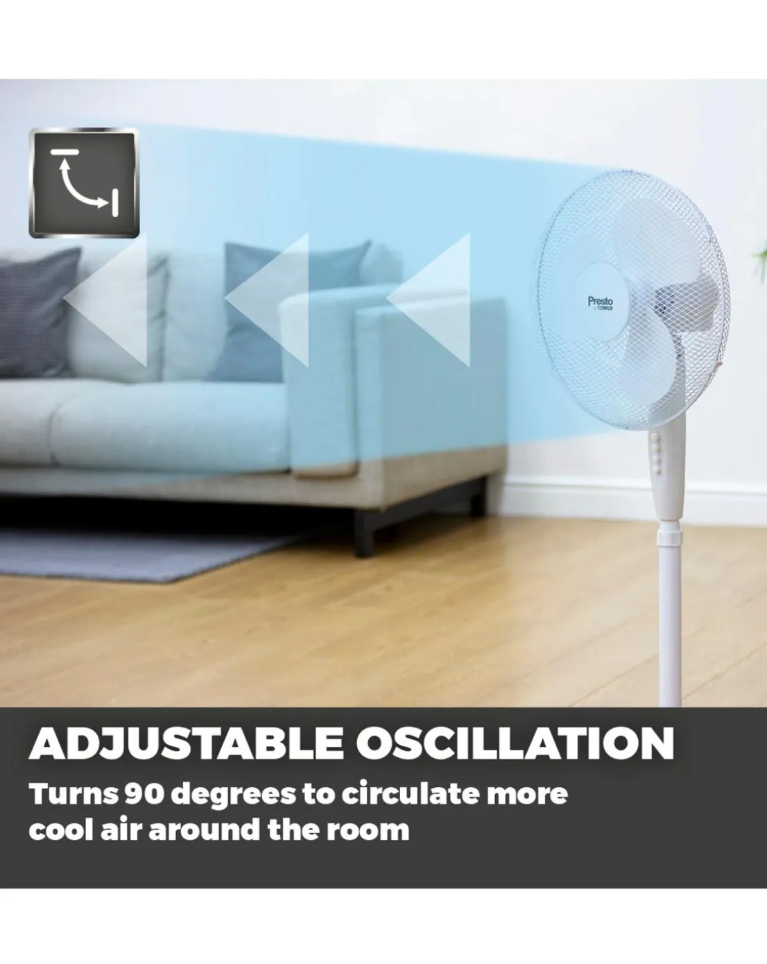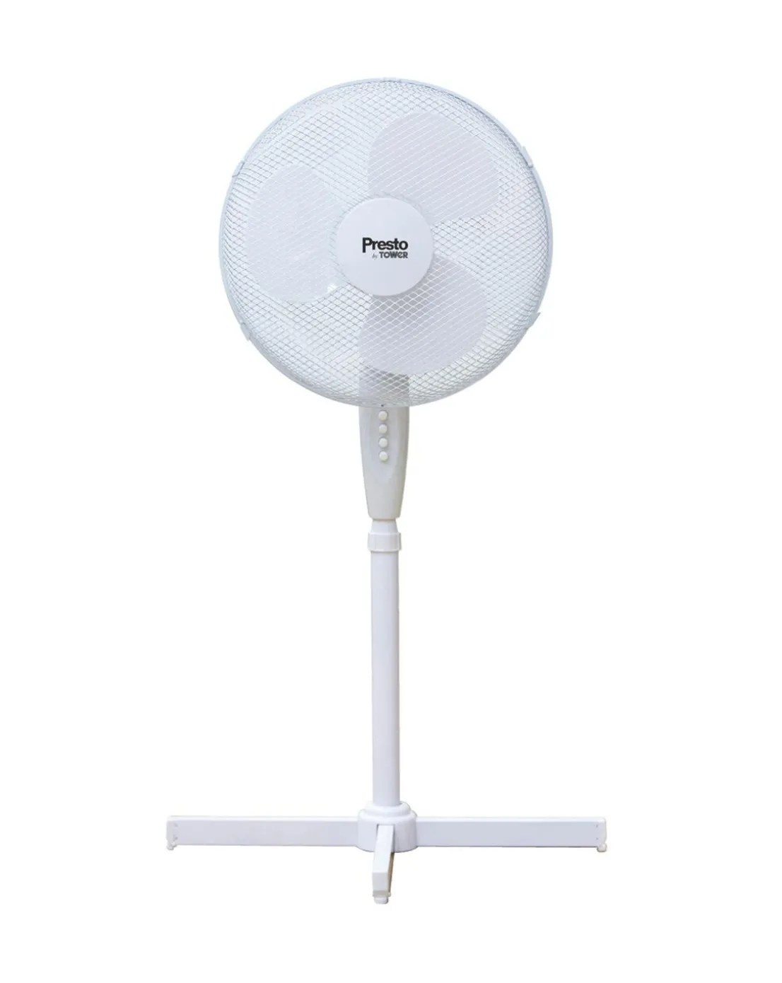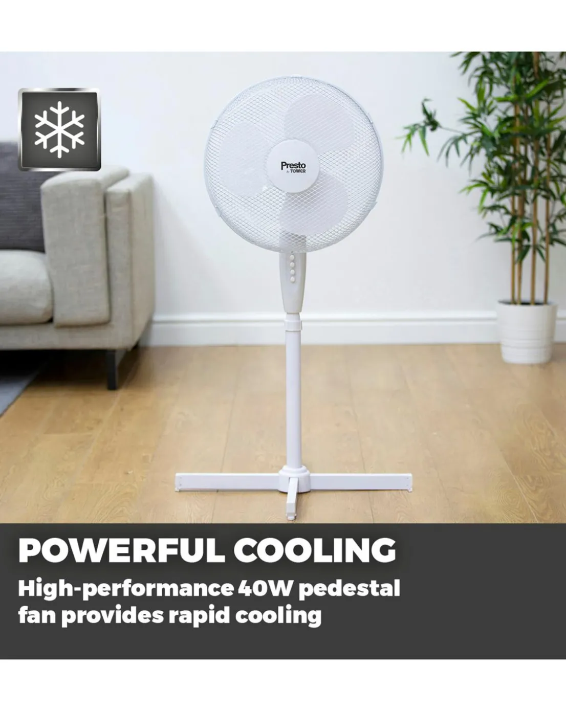 With simple assembly and high-velocity airflow, Presto by Towers 16 inch pedestal fan provides the perfect cooling solution to tackle the summer heat. It features 3 speed intensities, controlled via easy-to-use push buttons to select a comfortable amount of breeze. Airflow can be directed with precision using the 90 degree oscillation, adjustable height and tilt functions to target your chosen area with efficient cooling. Designed with a topple-resistant base and anti-slip rubber feet, the fan offers increased stability across any surface. The pedestal fan provides convenient cooling around the home with an integrated carry handle for easily transporting between rooms.